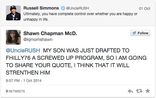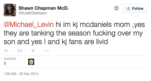 Drafté en 32ème position de la dernière Draft par les Philadelphie 76ers, K.J. McDaniels effectue un début de saison étonnant. En 11 matches disputés avec les pros, il a déjà montré de belles aptitudes pour défendre sur l’homme et s’est même offert l’un des plus beaux smashs de ce début de saison face à Orlando. Il tourne à 8,5 points et 2,6 rebonds en 22 minutes de moyenne. Déjà convaincue des talents de sa progéniture, la mère de K.J. McDaniels a fait part cette semaine de son agacement vis-à-vis de la politique de tanking menée par les Sixers depuis le début de la saison. Selon elle, son fils ne mérite pas de jouer parmi l’équipe la plus daubée de la ligue qui, d’ailleurs, reste toujours à la recherche de sa première victoire cette saison. Impuissante derrière son écran d’ordinateur, Maman McDaniels – que vous reconnaîtrez facilement à l’aide de son blase @kjmomshawn – a donc décidé d’extérioriser sa rage sur Twitter.