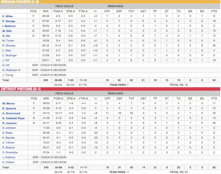 Près de 11 ans après l’épisode du Malice at the Palace, de l’eau a coulé dans le Lac Michigan et les Pacers se déplaçaient à Detroit pour un duel inter-division a priori à l’avantage des Pistons qui restaient invaincus avant hier soir. Tout commençaient plutôt bien pour les locaux, « Dédé » entamant son chantier face à l’un des frontcourt les moins costauds de la Ligue pour rester poli. La tâche devenait encore plus aisée lorsque Ian Mahinmi était forcé de rejoindre le banc après seulement cinq minutes dans le premier quart-temps pour une douleur au dos. Le Français ne reviendra pas le parquet de la rencontre. Mais à peine le joueur de la semaine de la Conférence Est était parti se reposer sur le banc avec les autres titulaires à la fin du premier quart-temps que les Pacers réalisaient une série mortelle de 22 à 0 dans les six premières minutes de la deuxième période. Les Pistons ne reviendront jamais, la faute à une défense agressive des hommes de Frank Vogel à l’image de George Hill (12 points, 6 rebonds, 6 passes et 4 des 15 interceptions de son équipe).