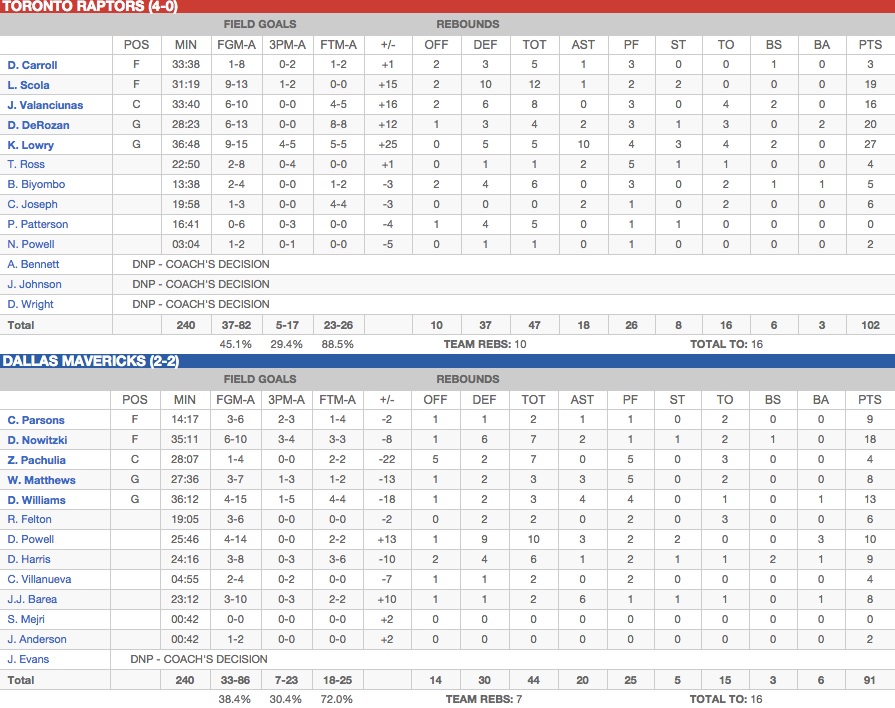 Une fois n’est pas coutume, les Raptors débutent leur saison sur les chapeaux de roue cette année et valident à l’American Airlines Center un quatrième succès de rang, marquant ainsi le plus beau départ de l’histoire de la franchise. Au coude à coude avec la bande à Dirk jusque dans le quatrième quart-temps, les Canadiens ont forcé le sort de la rencontre avant le money time avec un run de 12-0 à trois minutes de l’ultime sirène. Ensuite, Kyle Lowry finira le travail après avoir bien taffé les meneurs de Dallas toute la soirée. Le All-Star confirme un bon début de saison en enregistre son premier double-double avec 27 points à 9/15 au tir dont 4/5 du parking, 10 assists et 5 rebonds, tout comme Luis Scola qui a profité des errements habituels de Dirk en défense pour sortir son match référence (19 points, 12 rebonds et un gros triple pour sceller la victoire à 1:50). 102-91, score final, les Raptors font le plein de confiance avant de s’attaquer à un gros morceau dès ce soir, en back-to-back.