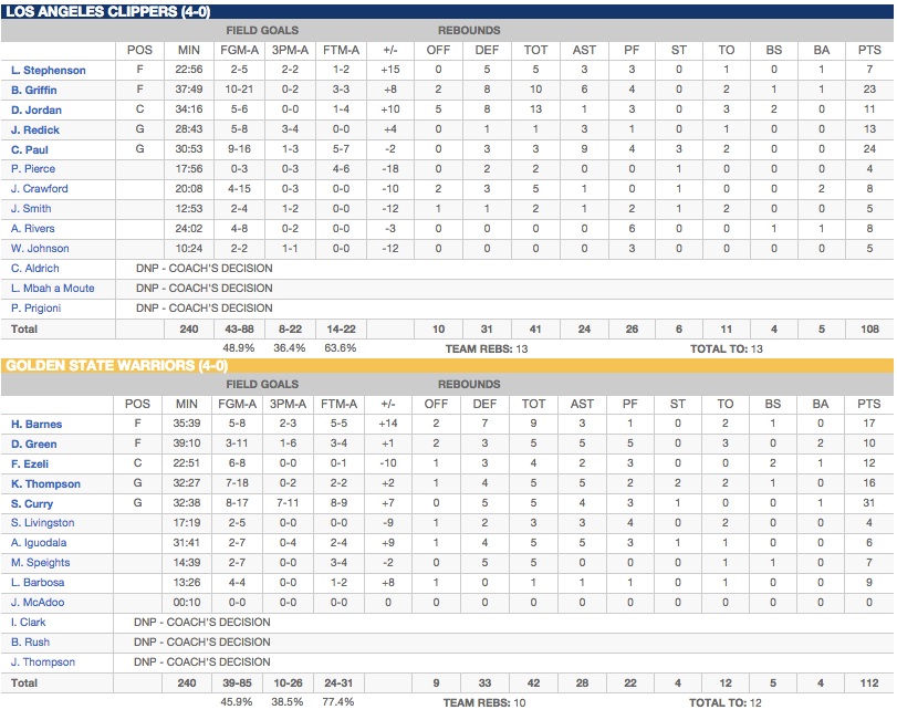Au retour des vestiaires, on se prend à s’étonner des échecs répétitifs de Stephen Curry derrière l’arc. Serait-il humain ? À l’image d’Austin Rivers, les Clippers sont plus impliqués en défense et récupèrent le momentum pour prendre jusqu’à 10 points d’avance dans le quatrième quart-temps. C’est le moment choisi par Harrison Barnes pour enchaîner une dizaine d’unités à coups de gros shoots derrière l’arc et de smash bien viril avant de donner le relais à un MVP qui a repris des couleurs dans le clutch pour asséner le coup de grâce (31 points, 5 rebonds, 4 assists et 0 balle perdue). Chris Paul tentera bien de lui voler la vedette à 19 secondes du terme mais la défense des Warriors n’est pas deuxième de la ligue pour rien. Les champions l’emportent finalement dans une rencontre qui sentait bon les Playoffs (112-108). Dire qu’on n’est qu’au mois de novembre…