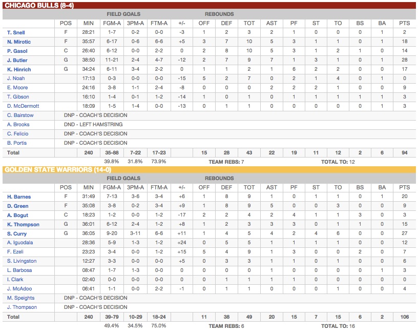 Visiblement, la frayeur de jeudi n’a pas servi de leçon aux hommes de Luke Walton qui commençaient du coup ce match comme ils l’avaient fait 24 heures plus tôt à Los Angeles. Rapidement, un écart de 11 points se crée donc en faveur des Taureaux. Puis les « Splash Brothers » se permettent de nous rappeler très vite leur classement dans la ligue pour recoller à 1 point à la fin du premier quart-temps. Nouvel avertissement sans frais pour les Warriors qui font preuve d’une sérénité en toute circonstance depuis le coup d’envoi de cette campagne 2015-2016. Les Bulls n’abdiquent pas pour autant et rêvent de reproduire leur performance du 27 janvier dernier, lorsqu’ils étaient venus mettre un terme à une série de 19 victoires consécutives des Dubs à l’Oracle Arena grâce à un Derrick Rose clutch au bout des prolongations. Sans le meneur, c’est Jimmy Butler qui porte les siens en attaque (28 points, 9 rebonds, 7 assists à 11/21) comme en défense où il s’occupe personnellement du cas de l’extraterrestre du nom de Stephen Curry sur certaines séquences. En face, c’est Harrison Barnes qui confirme son excellent début de saison avec encore 20 points et 9 rebonds à 7/13 au tir.