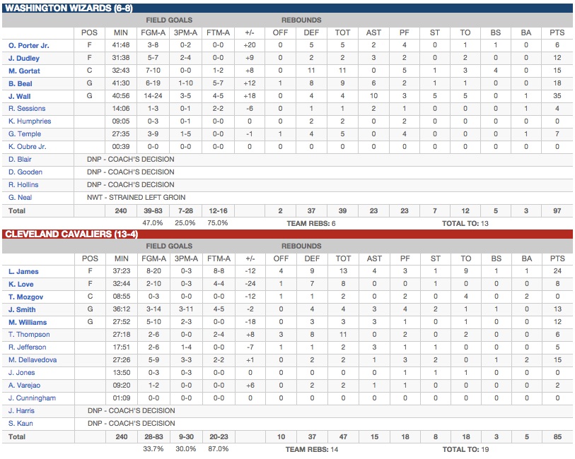 Celui qui s’autoproclame meilleur backcourt de la ligue aux côtés de Bradley Beal devra quand même mettre sa main à la poche pour faire monter la cagnotte de son assistant coach à cause de ses cinq balles perdues mais ces dernières ont été largement compensées par ses 35 points à 14/24 dont 3/5 du centre-ville ainsi que 10 assists, 5 steals et 4 rebonds pour bien faire comprendre le message à tout le monde. Bradley Beal n’était pas non plus en reste malgré une adresse au tir toujours suspecte (18 points, 9 rebonds et 6 passes à 6/19 dont 1/10 du parking). En face, LeBron était peut-être un peu fatigué comme en témoignent ses 9 pertes de balle malgré 24 pions et 13 rebonds. Le quadruple MVP était de toute façon bien trop seul pour espérer quelque chose dans cette partie alors que Kevin Love semblait déjà penser à son rendez-vous chez le barbier (8 points, 8 boards à 2/10).