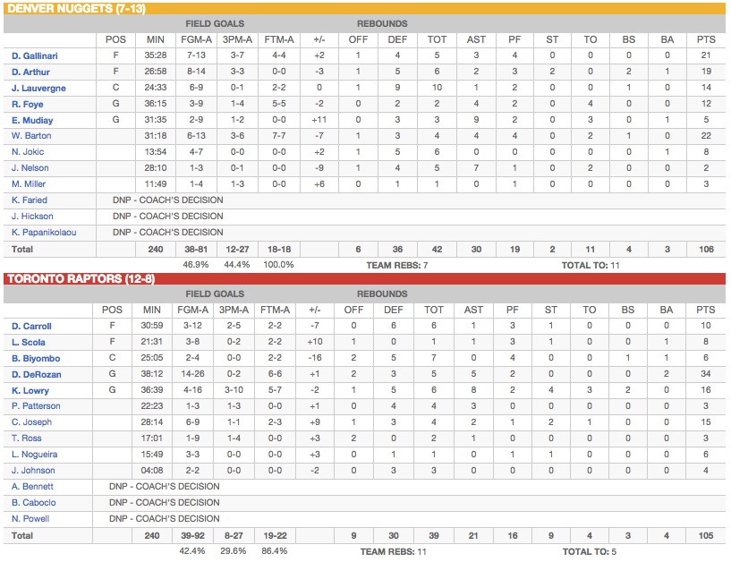 Alors que les deux équipes se présentaient déjà bien entamées à l’entre-deux initial pour leur second match en moins de 24 heures, c’est Denver qui prenait le meilleur départ avec un Joffrey Lauvergne qui retrouvait sa place de titulaire pour la première fois depuis sa blessure au dos. En l’absence de Jonas Valanciunas, l’Alsacien s’est d’ailleurs bien gavé dans la raquette en signant son premier double-double en NBA (14 points, 10 rebonds). Denver mène rapidement de 10 points grâce à l’étonnant Darrell Arthur (19 points, 6 rebonds à 3/3 du centre-ville mais en oubliant tout de même la dédicace à votre serviteur en train de se goinfrer de poutine bien grasse en tribune de presse) alors que Kyle Lowry avait déjà scoré tous ses points dans le quatrième quart-temps à Atlanta la veille (16 points, 8 assists, 6 rebonds mais 4/16 au tir dont 3/10 de la CN Tower). Son adversaire du soir, Emmanuel Mudiay, n’a pas plus de réussite mais prend soin de la balle (9 assists et 3 turnovers, son péché mignon d’habitude) et les Nuggets creusent leur avance avant la mi-temps (56-42).