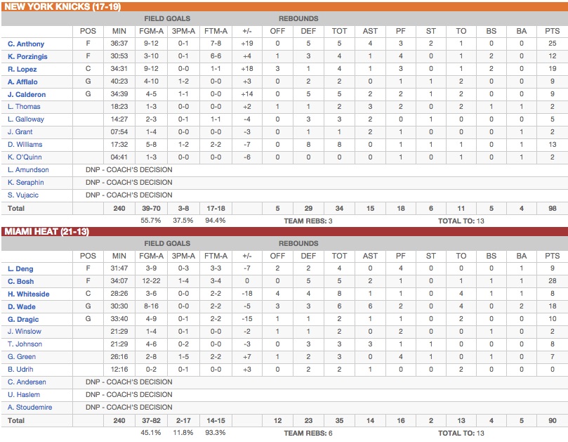 Avec ce nouveau succès, les Knicks (18-19) effectuent un nouveau rapproché avec Orlando et Charlotte aux portes du Top 8 à l’Est. Carmelo Anthony semble enfin avoir compris qu’il avait besoin de ses coéquipiers pour aller en Playoffs et c’est le tout le jeu de New York qui en profite.