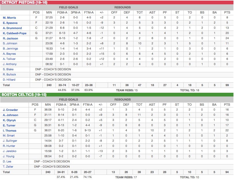 Un run de 9-2 en tout début de dernier quart permettait même à l’équipe de Stan Van Gundy de revenir pratiquement à hauteur de Boston avec 9 minutes sur l’horloge du TD Garden (75-77). Le moment choisi par Isaiah Thomas pour brancher le courant, alors qu’il restait sur 14 échecs en 15 tentatives jusque-là. Le lutin enchaînera les 15 derniers points de son équipe pour finir à 22 points, 10 assists et 5 rebonds à 6/20 au tir, mais ça ne sera pas suffisant face au collectif de « Motown ». En tout, quatre joueurs feront mouche du parking pour Detroit dans la quatrième période où Reggie Jackson ne sera pas en reste face à son vis-à-vis avec 9 points dans sa besace personnelle. Un ultime 3-points de Stanley Johnson scellera la victoire des Pistons à 58 secondes de l’ultime sirène, le rookie réalisant là son deuxième double-double en carrière grâce à ses 11 points et 10 rebonds en sortie de banc.