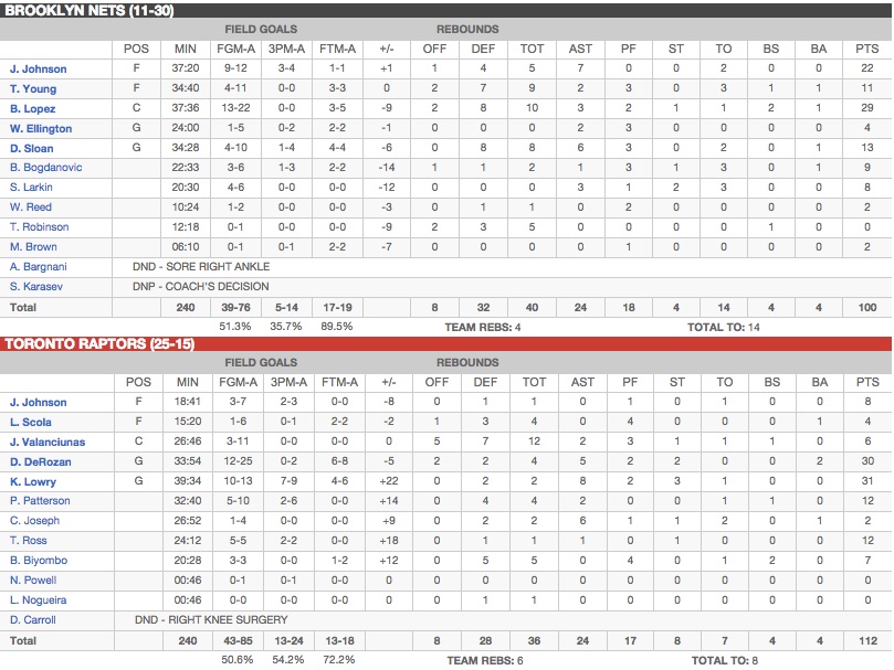 C’est la première fois que le binôme Lowry – DeRozan dépasse la barre des 30 points le même soir, une statistique qui illustre bien le casse-tête auquel était confronté l’intérimaire de Lionel Hollins, Tony Brown. Après 41 matchs marquant la moitié de la saison, les Raptors sont bien installés à la deuxième place à l’Est et ils auront l’occasion de la consolider lors des deux prochaines semaines à domicile. Les Nets, eux, continuent de naviguer tels des zombies dans les abysses du classement.