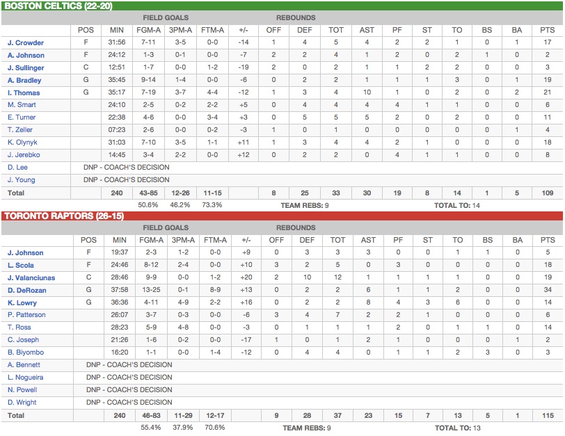 Comme souvent cette saison, c’est Luis Scola qui donne le ton dans le premier quart-temps. On peine à croire que l’Argentin a 57 ans et Amir Johnson est mis à l’amende par son remplaçant dans l’effectif des Raptors (11 points en 9 minutes). À moins qu’il ne faille y voir là une technique insidieuse de la part du numéro 90 pour forcer son coach à prendre temps-mort et ainsi recevoir un hommage vidéo touchant sur les écrans du Air Canada Centre. Le public est debout, d’autant que DeMar DeRozan profite de la sortie d’Avery Bradley pour assurer sa dizaine de points traditionnelle à la fin d’un premier quart-temps très offensif remporté 35-27 par les locaux. Mais la troisième défense la plus efficace de la Ligue (101,1 points encaissés toutes les 100 possessions) retrouve ses principes dès l’entame du second quart. Les bulldogs verts et blancs reprennent du service et cadenassent le backcourt de Toronto qui avait fait si mal à Brooklyn lundi dernier. En attaque, Jonas Jerebko et Kelly Olynyk confirment leur statut de joueurs les plus swag de la Conférence Est et enchaînent les ficelles sur le parking. La troisième faute de « Calorie » en milieu de période n’arrange rien et les hommes de Brad Stevens basculent en tête à la pause grâce à un binôme Bradley-Crowder intenable des deux côtés du parquet (62-56).