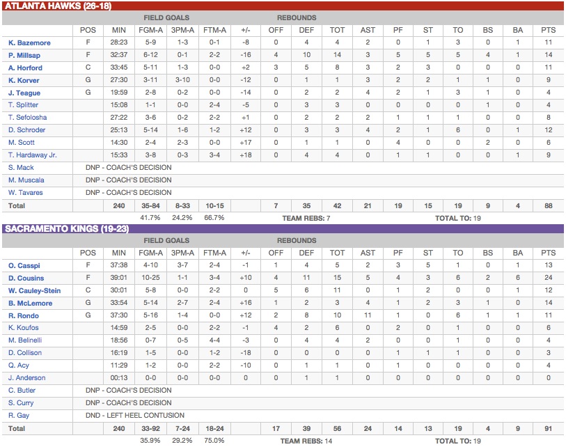 Quand l’intello de la classe tombe avec le cancre pour réaliser un exposé, ça fait des étincelles. C’est à peu près le résumé de la partie qui s’est jouée hier à l’Arco la Sleep Train Arena entre deux franchises que tout sépare, ou presque. Car en maîtrisant le retour des Hawks dans le dernier quart-temps grâce à un DeMarcus Cousins en mode arrosoir de chez Gamm vert mais décisif (24 points et 15 rebonds à 10/25 au tir), Sacramento est officiellement redevenue playoffable à l’Ouest ce matin. Ça n’aura pas été une partie de plaisir pour les troupes de George Karl qui jouaient aussi contre les livres d’histoire alors que Sacramento ne s’était plus imposé face aux Hawks depuis 2008 soit 15 face-à-face perdus entre temps. En chef de file, Paul Millsap (14 points et autant de rebonds) a bien failli leur jouer une nouvelle fois la chanson mais ces Kings ont quelque chose de différent cette année et ils tenaient à le faire savoir.