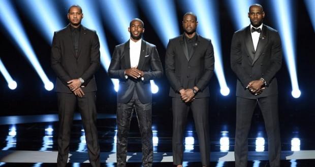 Clin d’œil habile, bel auto-clash, et signe qu’il a pu prendre du recul sur ses finales. Sa cérémonie était l’an dernier, celle-ci est celle de LeBron. Avec toutes ces distinctions, le kid d’Akron est ainsi beaucoup monté sur scène, avec Kyrie Irving et Kevin Love pour ceux récompensant les Cavs, mais également avec ses brothers Dwyane Wade, Chris Paul et Carmelo Anthony pour appeler les athlètes à s’engager :