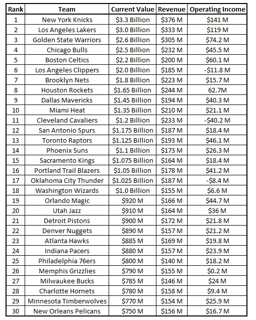 Si vous espérez gagner au Loto pour racheter votre franchise de cœur, c’est raté. Ou alors il faut espérer rafler le jackpot tous les vendredis pendant plusieurs années consécutives. En effet comme chaque année, le magazine Forbes a dévoilé la valeur des 30 franchises qui peuplent la Ligue. Sans surprise, on retrouve les Knicks en tête, suivis de près par les Lakers. En cumulé, ils ont perdu près de 68% de leurs matchs depuis trois saison et demi. Mais New York et Los Angeles restent de très gros marchés et même des crises aussi délicates que celle que traversent les protégés de Phil Jackson en ce moment n’influencent pas suffisamment le marché pour réduire leur valeur. Les propriétaires ont profité d’un contrat record avec ESPN et TNT pour s’en mettre plein les poches et le nouveau CBA assure encore leurs intérêts. La NBA a atteint son âge d’or et la valeur moyenne d’une franchise maintenant estimée à 1,36 milliard de dollars, soit 3,5 fois plus qu’il y a cinq ans. Pas étonnant alors que les propriétaires s’en mettent plein les poches alors que l’on se rappelle que Steve Ballmer avait dû débourser 2 milliards de billets verts pour s’offrir les Clippers en 2014 à titre d’exemple.
