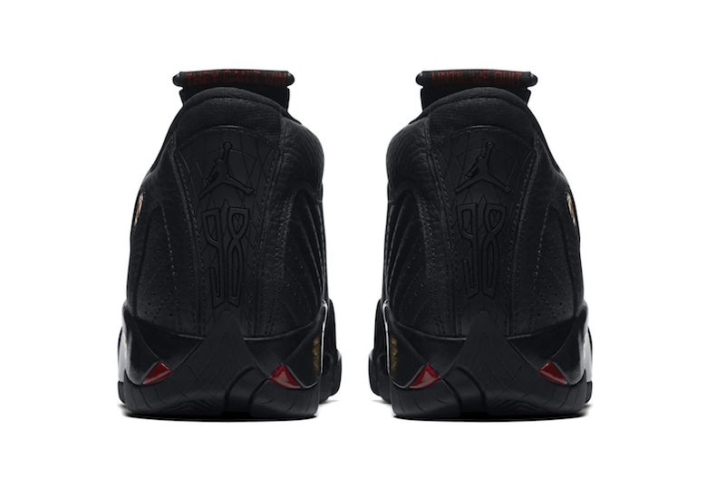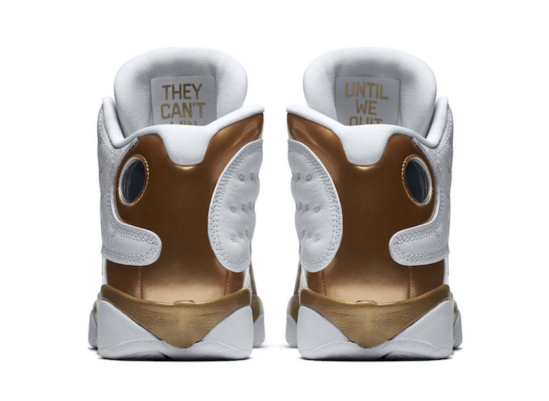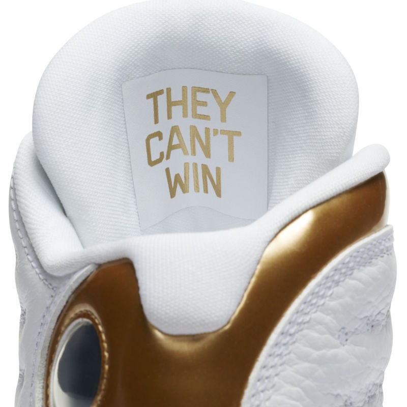 Pas étonnant que ces modèles soient choisis pour l’occasion, puisqu’il s’agit des deux paires que Michael Jordan a chaussées durant la conquête de cet ultime titre avec les Bulls. Si les Air Jordan 13 l’ont accompagné une grande partie de la saison, il a finalement opté pour la quatorzième itération de ses signature shoes à partir de la mi-temps du Game 5 face au Jazz. Et c’est avec ces dernières qu’il a crucifié Bryon Russell, la franchise de Salt Lake City et tout Utah lors du Game 6 sur la dernière action de sa carrière, la suite aux Wizards n’étant qu’une invention de notre imaginaire. Dans ce Defining Moments Pack, les Air Jordan 13 s’appuient sur une empeigne en cuir blanc, avec quelques touches de doré, en particulier au niveau de la semelle intermédiaire et au-dessus du talon. L’hologramme « œil de chat » placé vers la cheville représente Michael Jordan devant le nombre 98, année de l’événement. Autre détail sympa, la citation de MJ sur les languettes, à l’intérieur. « They can’t win » à gauche, « until we quit » à droite. Les Air Jordan 14 seront-elles quasiment toutes en noir, seul un peu de doré se pointant là encore.
