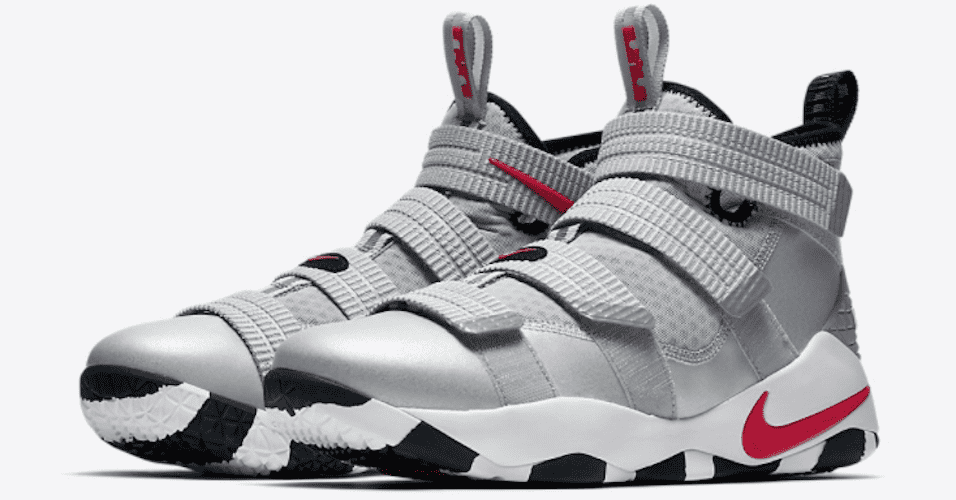 Une nouvelle version qui s’inspire de certaines des groles préférées de LeBron James, à savoir les Nike Air Max 97 Silver Bullet. C’est donc sous le même nom et en suivant le même thème que les LeBron Zoom Soldier 11 vont débarquer. À l’instar donc des Air Max, la base des pompes sont en gris métallique, de l’empeigne au talon en passant par la languette et les sangles qui remplacent les lacets. Toujours à l’image du modèle d’origine, du noir, du blanc et du rouge complètent l’ensemble en s’incrustant sur différents détails ainsi que sur la semelle. Celle-ci est zébrée entre les deux premières teintes, tout en voyant ces motifs contrariés par un énorme Swoosh et le logo de King James en rouge. Enfin, on retrouve la virgule de Nike en rouge dans un ovale noir sur la seconde sangle des Zoom Soldier, marque qui prenait place sur la languette des Air Max 97 Silver Bullet.