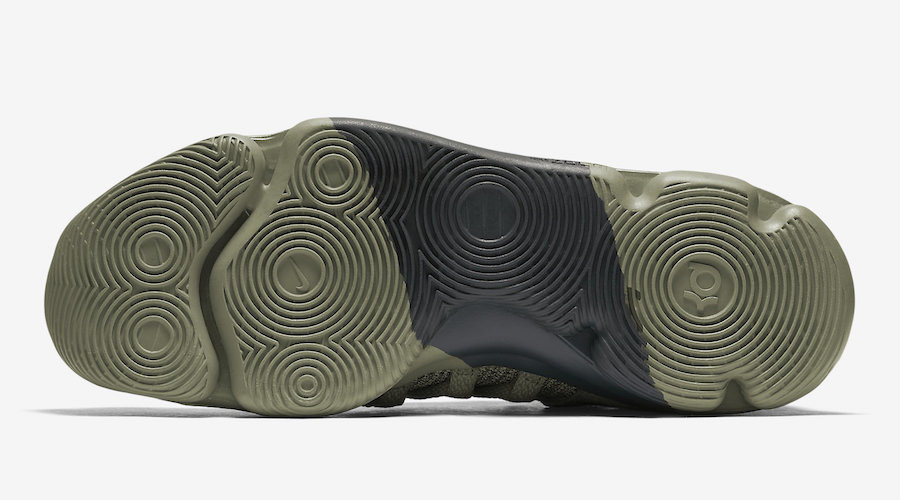 On reste donc sur des teintes sombres pour cette version des KD 10 puisque après le noir qui recouvrait les Triple Black – ça vous surprend on imagine – c’est au tour d’un coloris militaire de prendre place sur les groles de Durant. Ben oui, il s’agit d’une version en hommage aux vétérans de l’armée aussi appelée Veteran’s Day Une teinte baptisée stuc foncé qu’on a déjà pu apercevoir sur de nombreux modèles de chez Nike et qui cette fois-ci est présente sur la partie supérieure des KD, de l’empeigne au talon, du Flyknit au daim présent à l’arrière des chaussures, au niveau du talon. Mais du noir vient troubler un peu cette uniformité en se glissant sur le logo KD de la languette ou encore le Swoosh du panneau latéral. Mais surtout au niveau de la semelle. Car si cette dernière, aussi bien dans sa partie intermédiaire qu’extérieure, est majoritaire dans la teinte du stuc, elle est traversée au milieu du pied par une large bande noire qui donne du caractère au modèle, à défaut de le faire pour Kevin Durant le faux thug. Oups, on n’avait dit pas de vanne, désolé.