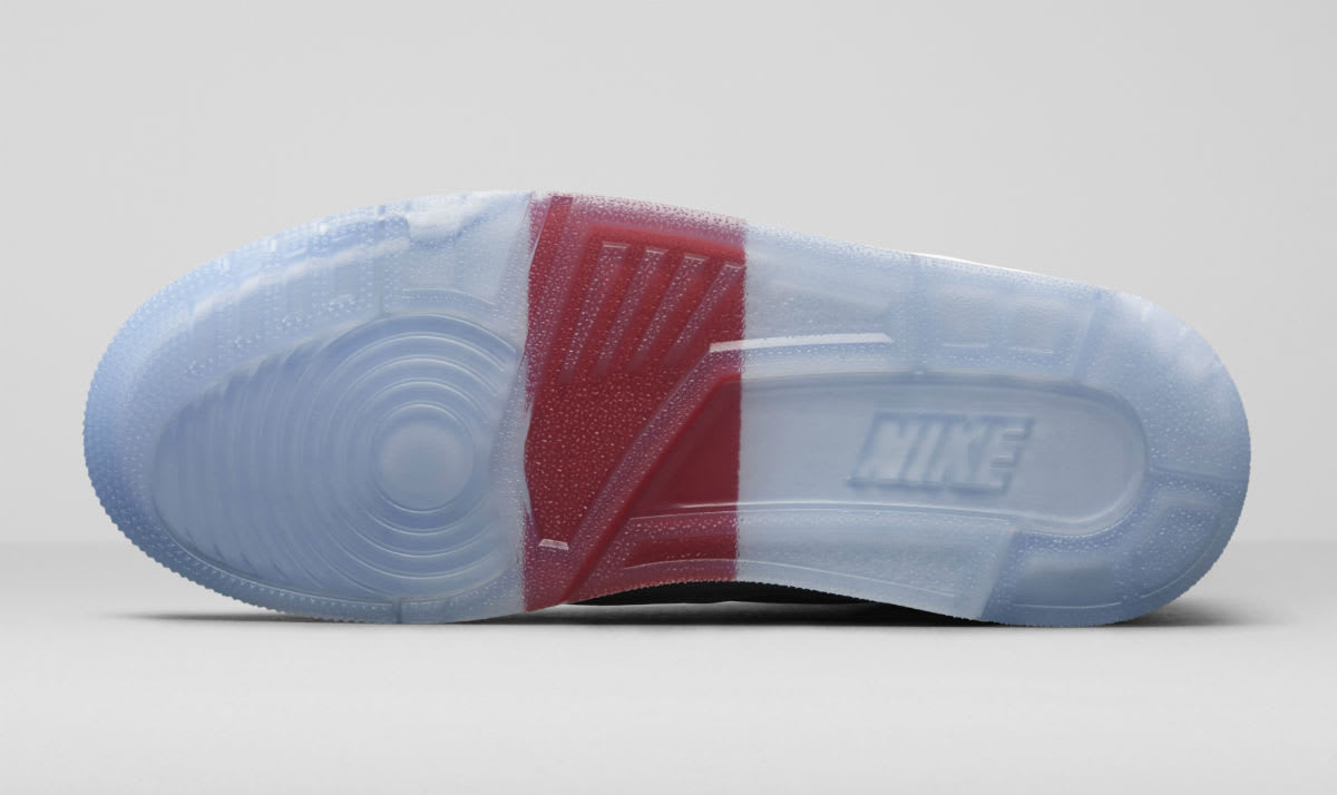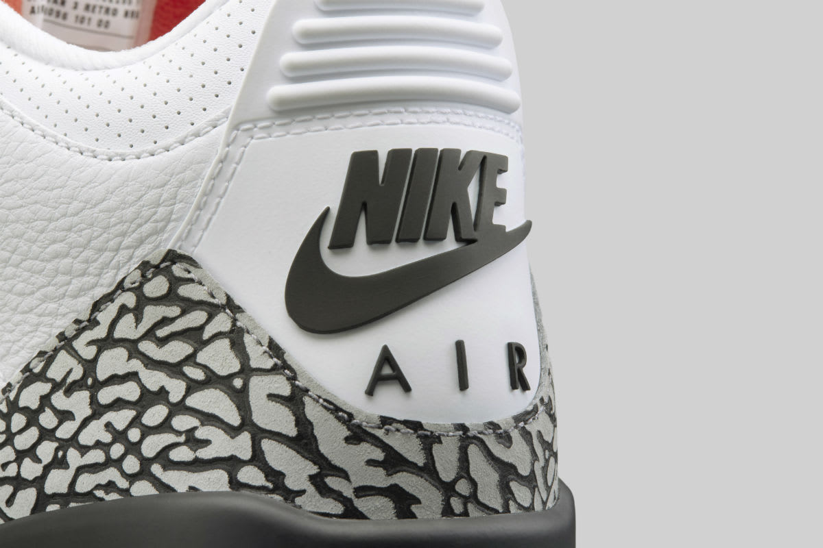 Pour ces Air Jordan 3 White Cement NRG, le coloris est le même que celui d’origine. On part donc sur une base blanche sur l’empeigne, avec un Jumpman rouge sur la languette. Du rouge qu’on retrouve sur la doublure, mais aussi – et c’est là une nouveauté pour l’occasion – sous la semelle. Un trait marque en effet l’emplacement de la ligne des lancers francs quand Michael Jordan a pris son appui, preuve s’il en fallait qu’il a bien mordu et qu’il n’a pas réalisé un dunk si fou que ça. Le reste de la semelle est en blanc – pour la partie intermédiaire – et translucide sous le pied. le gris « ciment » qui donne le nom au modèle et le noir prennent place avec les traditionnels motifs devant les orteils et au niveau du talon. Derniers détails qui rappellent la soirée mémorable de 1988, les inscriptions 147 derrière la languette – soit le score de Michael Jordan ce soir-là – et le 3:51 bien caché derrière la tirette arrière qui lui donne l’heure à laquelle le numéro 23 a décollé.