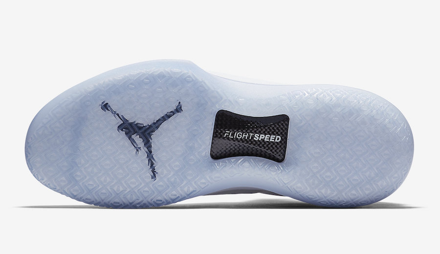 Comme toujours le principe est simple pour une telle version : un style épuré, de la sobriété et un côté classe toujours appréciable, surtout pour ceux qui apprécieront un aspect bien plus neutre que pour les coloris universitaires cités un peu plus haut. C’est donc du blanc pour un look platine qui s’installe sur l’intégralité du modèle, aussi bien pour la partie en Flyknit sur l’avant que sur le reste de la languette ou la surcouche qui entoure la cheville. D’ailleurs, l’intérieur où vous glissez votre pied est blanc lui aussi, tout comme les lacets. On notera tout de même que le Jumpman sur la semelle intermédiaire blanche est légèrement gris – platine si vous voulez ergoter – tout comme le logo Air Jordan sur la languette. Enfin, la semelle extérieure est translucide avec son style glacé, laissant apparaître un nouveau Jumpman bleu marine cette fois-ci.