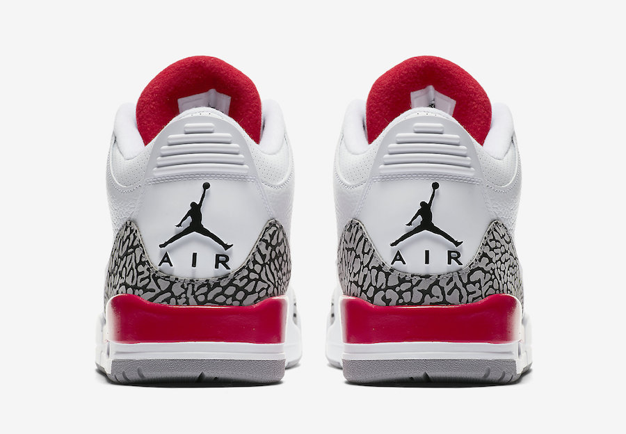 On retrouve donc le design de ce modèle de charité, avec sa base blanche sur la partie supérieure. Du blanc présent également sur la semelle intermédiaire, même si celle-ci est complétée à l’arrière par une dose de rouge, pendant que le dessous de la chaussure est en gris. Ces deux teintes – rouge et gris- mettent en avant les différents détails des Air Jordan 3 avec entre autres le Jumpman de la languette de la première couleur citée, tout comme les œillets des lacets. le gris prend place au niveau des traditionnels prints éléphants vers les orteils et le talon. Notons enfin qu’un autre Jumpman, cette fois-ci au dos du modèle est en noir.