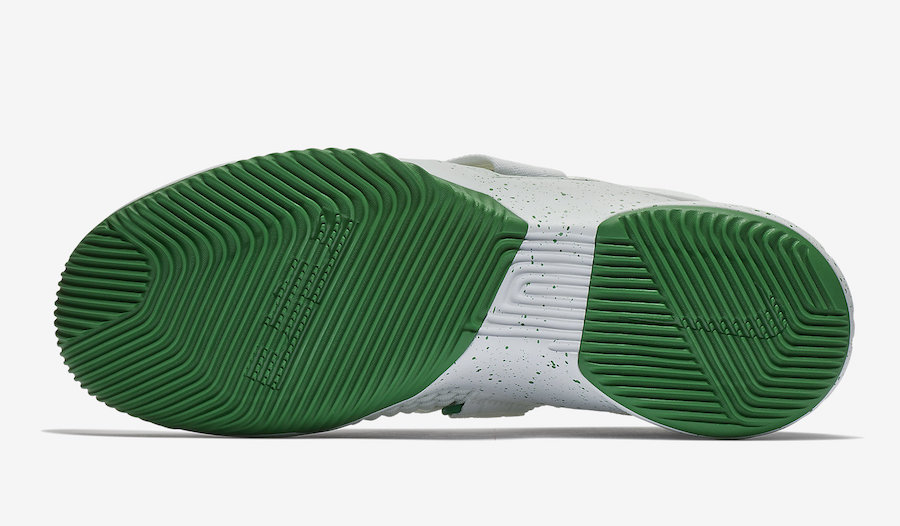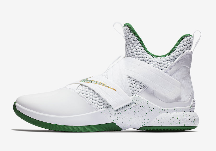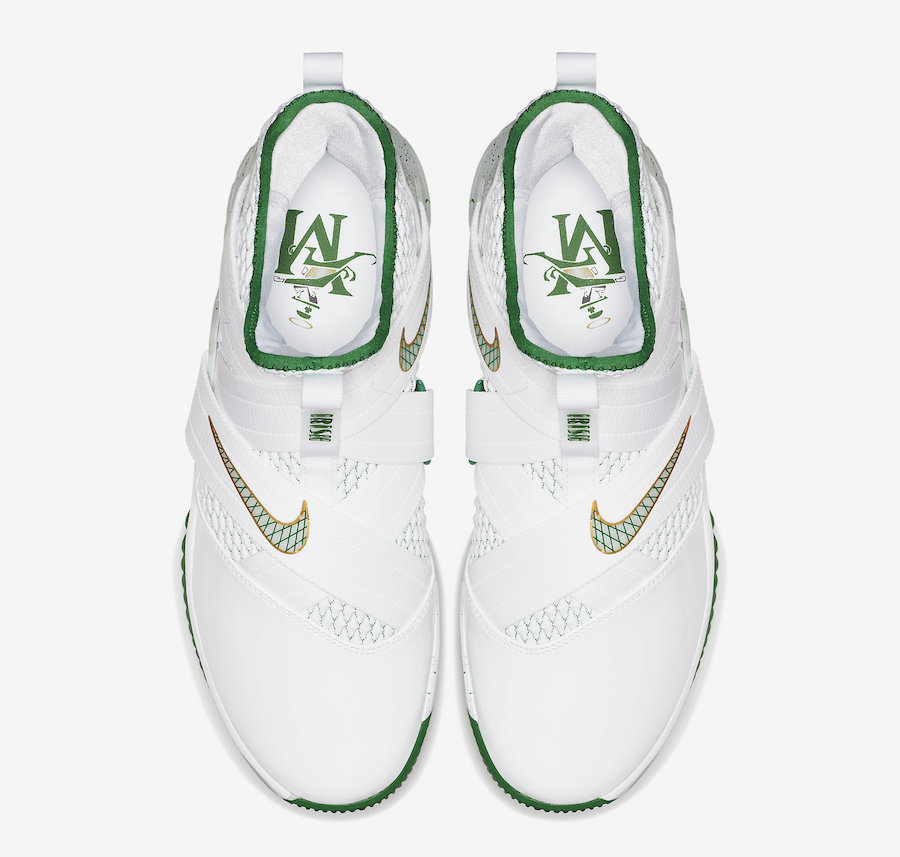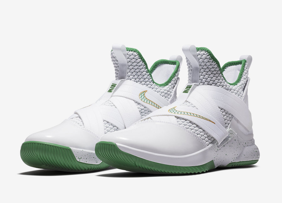 Enfin simple lycéen… on exagère un peu tant il a rapidement attiré les regards des observateurs avisés. Trois années de suite élu Mr. Basketball de l’Ohio, il a même tenté de rejoindre la NBA un an avant la fin de son cursus scolaire. Pas du goût de la NBA qui n’a pas laissé celui qui n’était pas encore un cyborg contourner le règlement. Sa dernière année à St. Vincent-St. Mary sera d’ailleurs un véritable délire avec des matchs retransmis sur le câble pour permettre au plus grand nombre de découvrir celui que Sports Illustrated va surnommer « The Chosen One » en le mettant en première page. Un statut qu’il a dû et su assumer, une étiquette lourde à porter. Mais le gamin a grandi, pris du volume et surtout rarement déçu. Tout n’a pas été parfait, mais aujourd’hui il a sa place dans les livres d’histoires. Pas ceux qu’on étudie sur les bancs de son ancien lycée, mais ceux de la Grande Ligue, et ce, même si sa carrière n’est pas encore bouclée. Alors replongeons-nous dans son passé, avant les titres, The Decision, les défaites en Finales ou tous les records. Quand il portait encore l’uniforme vert et blanc de St. Vincent-St. Mary, dont les couleurs se retrouvent donc sur cette version des LeBron Soldier 12. Du blanc donc qui constitue la base de ce modèle et qui est présent sur toute la partie supérieure. Du vert sur le contour de la cheville, la semelle extérieure ou encore sur celle intermédiaire, via de nombreux points qui maculent la teinte claire.