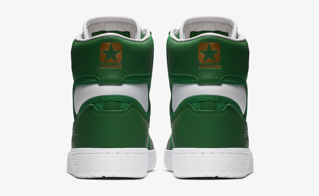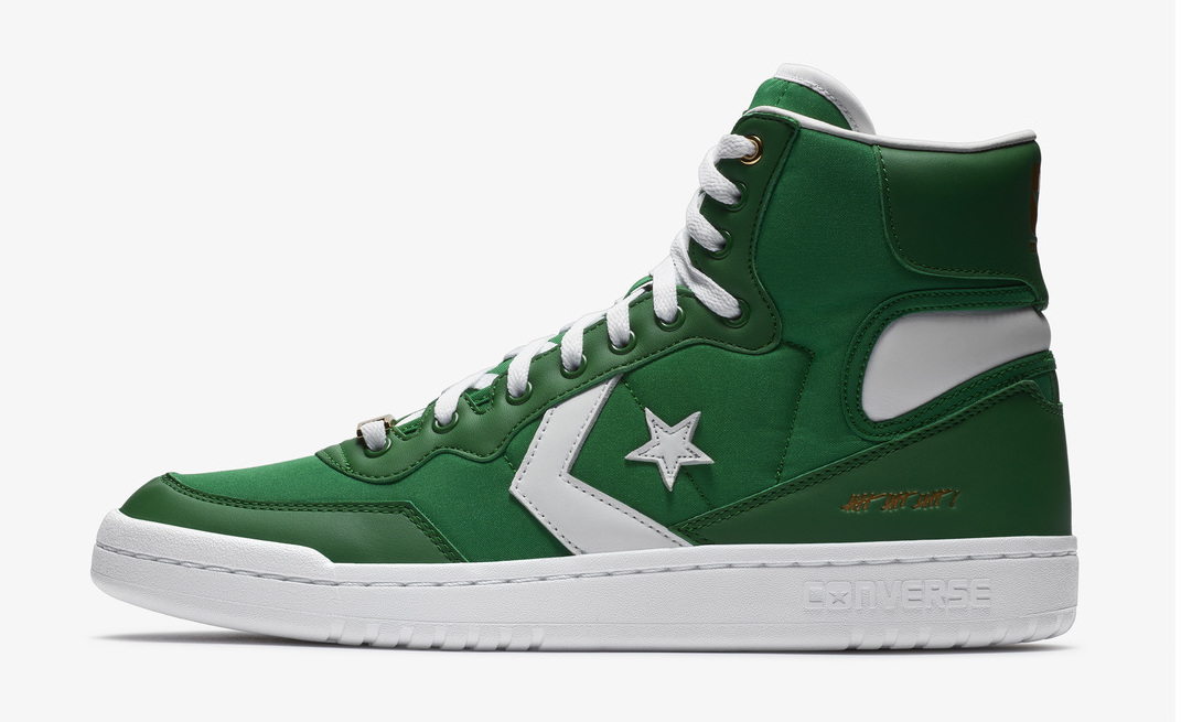 En 1984, les Lakers et les Celtics commencent à avoir l’habitude de se rencontrer à la fin de la saison pour se disputer le titre. C’est la septième fois que les franchises se retrouvent ensemble à ce stade de la compétition. Autant dire qu’on peut parler de rivalité, même si la dernière confrontation entre les deux équipes en Finales NBA remonte à 1969. L’absence de passé récent entre les Purple and Gold et la Green Nation ne diminue pas pour autant l’intensité du duel. Alors quand les Lakers s’offrent un concours de dunks lors du Game 3 remporté aisément à domicile, Larry Bird voit rouge et fait clairement comprendre à ses coéquipiers qu’il attend une réaction d’orgueil, les traitant de « Sissies » après la rencontre. Message reçu cinq sur cinq par Kevin McHale qui n’hésite pas à descendre Kurt Rambis alors que ce dernier pensait pouvoir finir tranquillement au panier. No easy buckets cette et un joli résumé de l’intensité de cette rencontre. C’est donc en référence à ce coup de la corde à linge que ces Converse Fastbreak Hi – quelle ironie, le fastbreak étant plutôt chez les Lakers – reprennent les teintes des Celtics avec une base verte complétée par du blanc.