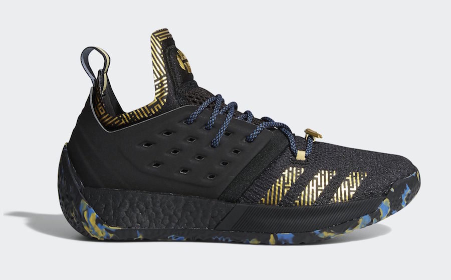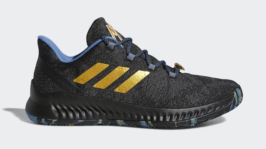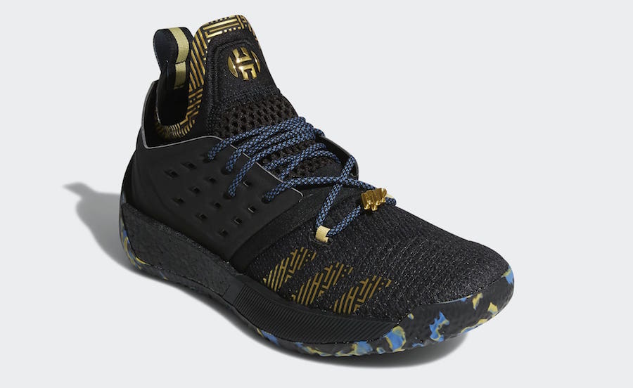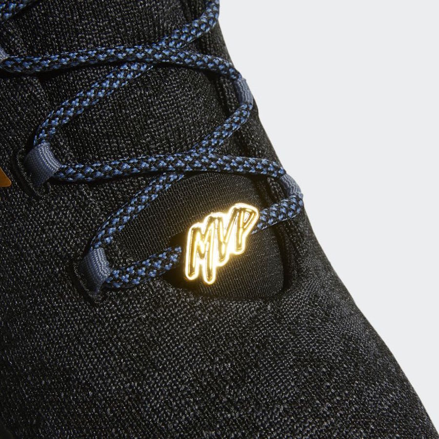 Pour l’occasion, Adidas balance donc les Adidas Harden Vol. 2, Harden Vol. 2 LS et Harden B/E 2 en mode MVP. Trois paires, mais un seul coloris utilisé. Cette version s’appuie sur une base noire qui recouvre la quasi totalité de la partie supérieure des modèles ainsi que leur semelle intermédiaire. Rien d’exceptionnel pour débuter, mais cette fondation sombre est complétée par des touches dorées et bleues. La teinte métallique se place au niveau des trois bandes ainsi que sur le logo – le H pour le modèle Vol. 2 classiques, une inscription MVP pour les autres pompes – sur la languette. Les lacets mêlent bleu et noir alors que la semelle extérieure reprend les trois couleurs.
