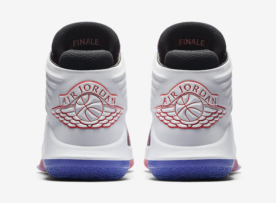 Si rien ne garantit encore qu’il s’agisse de l’ultime coloris des Air Jordan 32, un tel nom laisse à penser qu’on va bientôt voir débarquer les AJ33. En attendant de savoir ce que la marque nous réserve, jetons un œil à cette version Finale. L’empeigne en Flyknit est de plusieurs couleurs, mêlant du rouge tirant sur le rose et un bleu indigo. Ou peut-être du violet, désolé pour l’absence d’expertise chromatique. On retrouve ce mélange sur les logos Wings présents sur la languette, alors que ceux à ‘l’arrière du modèle sont intégralement rouge, contrastant avec la surcouche en cuir blanc qui entoure la cheville, blanc qui se propage sur la semelle intermédiaire. Celle extérieure reprend quant à elle les teintes plus colorées avec le rouge sur le devant et le violet plus à l’arrière. Enfin on notera l’inscription « Finale » au dos de la languette.