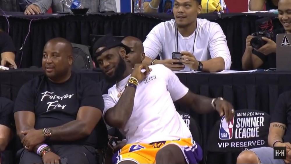 A l’occasion du match de Summer League opposant les Lakers aux Pistons, LeBron James est venu soutenir ses futurs coéquipiers à Las Vegas. Vêtu d’un short aux couleurs de sa nouvelle franchise, il s’agissait de la vraie première sortie de King James en tant que purple and gold. Évidemment, tous les regards étaient braqués sur celui qui a décidé le 2 juillet dernier de donner un nouvel élan à sa carrière et d’emmener ses talents d’acteur à Hollywood. Le numéro 23 a porté chance à son équipe qui s’est facilement imposée face à une équipe de Detroit faiblarde.