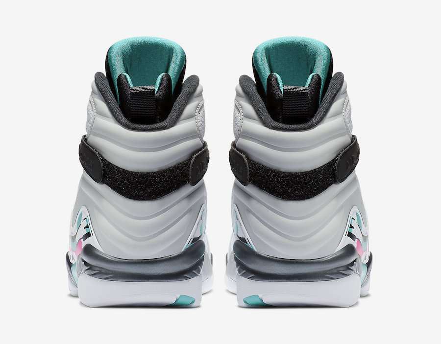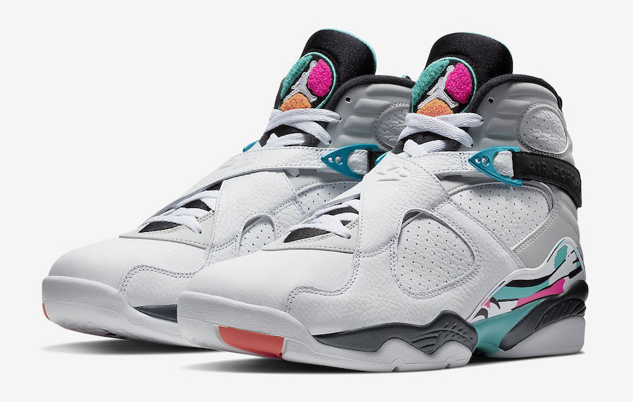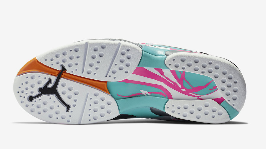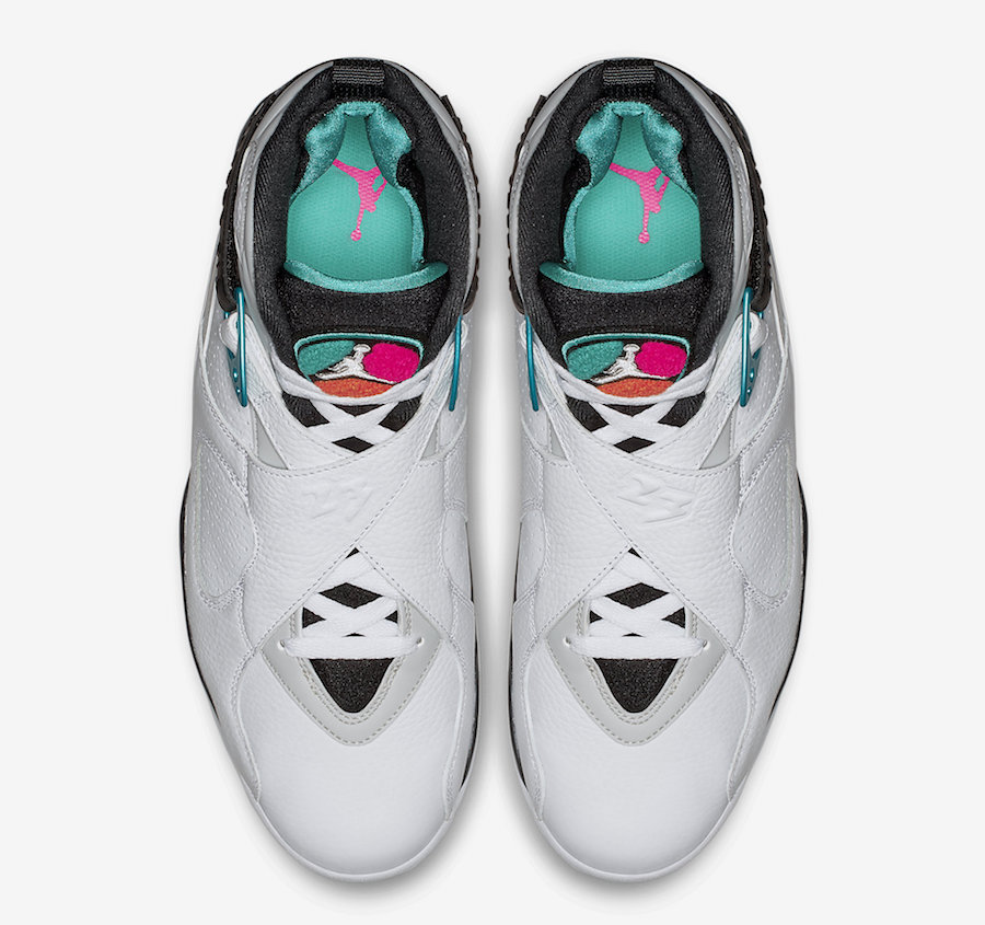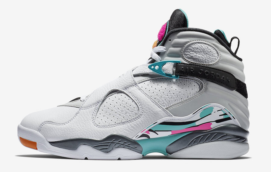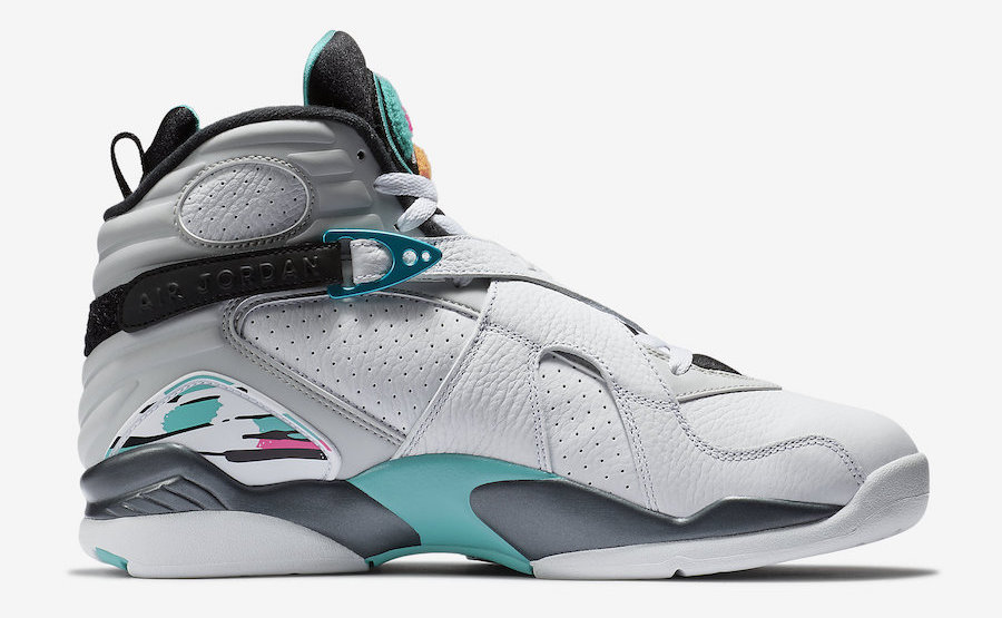 Si on évoque la plage de Miami devant le modèle, c’est bien la confirmation qu’on semble du côté du soleil avec ce coloris. Pourtant c’est bien plus à l’ouest des States que l’inspiration est puisée, en se replongeant quelques décennies en arrières. Les fans des nineties auront certainement reconnu sur la base blanche des Air Jordan 8 les couleurs qui prenaient place en arrière-plan du logo des Spurs dans les années quatre-vingts-dix. Le vert – proche du turquoise – le rose et le orange mais aussi le noir complètent la partie supérieure en cuir blanc – et ses fameux straps de maintien recouvrant les lacets – s’affichent sur le logo Jumpman des languettes, vers la semelle intermédiaire ainsi que sous le pied.