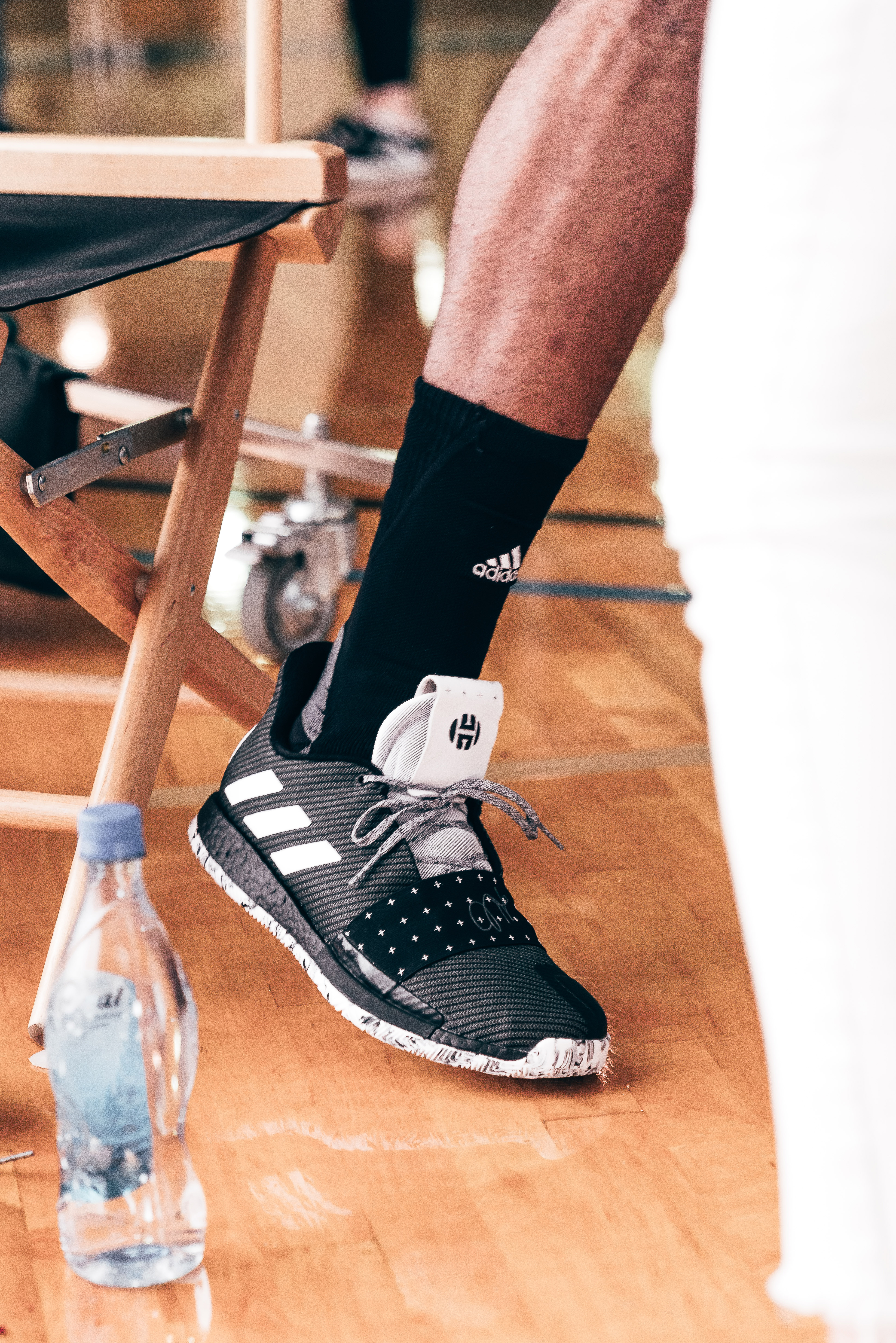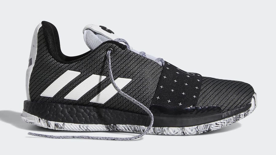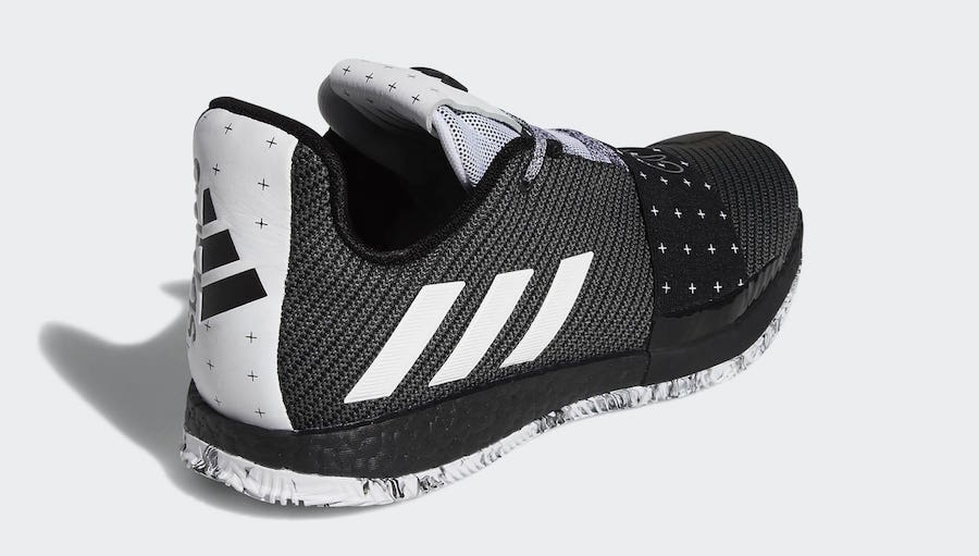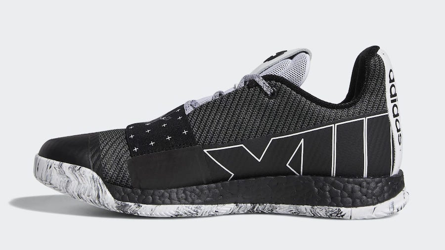 À l’instar des Harden Vol. 3 Voyager, le coloris Cosmos avait été présenté rapidement lorsque les nouvelles signature shoes de James Harden étaient dévoilées au grand public et les photos sont donc consultables en ligne depuis quelques semaines. Sauf que l’intérêt d’une paire de pompes, c’est d’être chaussée et pas seulement matée derrière un écran. Mais avant de décider de craquer pour cette version qui rend hommage à la capacité du joueur des Rockets à envoyer ses adversaires dans l’espace lorsqu’ils tentent de défendre sur lui, autant savoir quelle gueule elle a. Plutôt sobre avec une palette de noir et de blanc, les Harden Vol. 3 Cosmos devraient pouvoir se marier avec de nombreuses tenues. Si la partie supérieure est principalement en noir avec du blanc pour encadrer le XIII sur le panneau intérieur ou mettre en relief les trois bandes ainsi que la languette, on notera l’utilisation de cette teinte foncée au niveau de l’amorti Boost, chose plutôt rare chez Adidas. La semelle extérieure quant à elle est blanche, même si du noir se glisse là aussi.