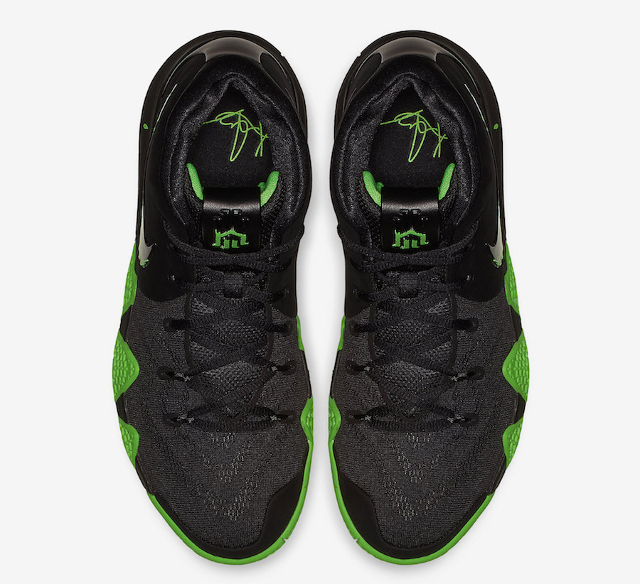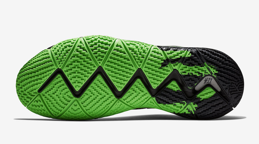 On ne présente plus les Kyrie 4 qui ont déjà bien rempli les rayons des magasins avec leurs nombreuses versions, même si finalement on a été privés de leur présence sur les parquets en fin de saison dernière à cause de la blessure du meneur de Boston. On peut constater d’ailleurs qu’avec ce coloris, même si le vert diffère de celui de la franchise du Massachusetts, on peut imaginer un jersey des Celtics à enfiler pour votre déguisement d’Halloween. Bon ok, la base est noire sur le Flyknit et les C’s complètent leur Green Nation plutôt avec des touches de blanc, mais il n’y a rien de choquant non plus à faire cohabiter cette teinte sombre avec Beantown si elle est accompagnée de vert. Ce que fait ce modèle, où une semelle verte et un aspect dégoulinant du même ton s’ajoute sur le Swoosh du panneau latéral. Ce vert assez flashy se retrouve également au niveau du logo KI de la languette, emblème du joueur chez Nike.