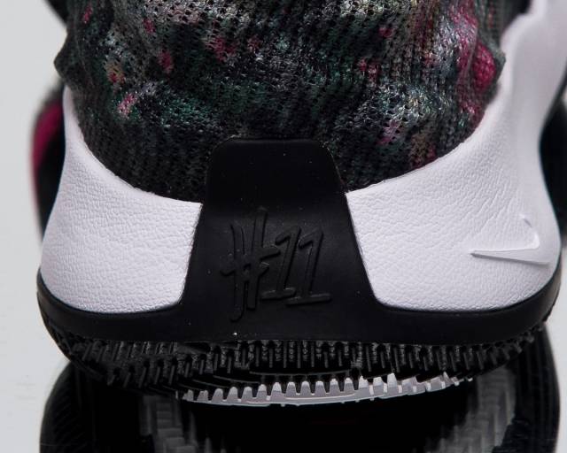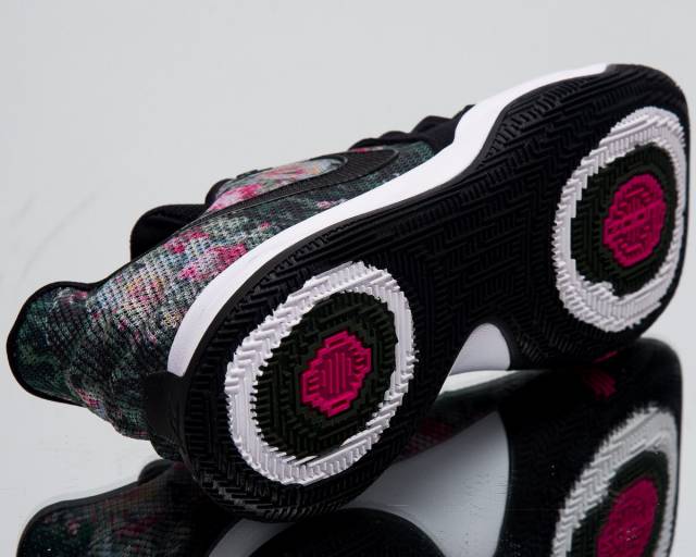 Les Nike Kyrie low s’appuient sur les principales caractéristiques de la gamme du meneur des Celtics, à savoir l’amorti Zoom, une semelle incurvée pour plus de vitesse et d’accélération ainsi qu’une partie supérieure reconnaissable qui mise sur le confort. Au sujet de l’amorti évoqué rapidement, on constatera un changement par rapport aux Kyrie 4 avec un accent mis sur un toucher plus doux sous le pied. Autre point notable, les motifs concentriques sous la semelle pour assurer la traction et qui rappelle ce que Nike a déjà utilisé sur les Kobe 10. Voilà pour la partie technique. En ce qui concerne le design on retrouve la silhouette qui fait la marque de fabrique des Kyrie avec une sangle recouvrant une partie des lacets. Dans ce coloris Black Foral, on retrouve un motif fleuri pour complété une base noire et une semelle intermédiaire blanche.
