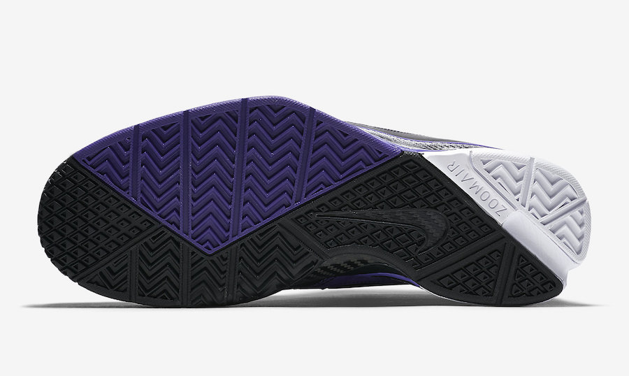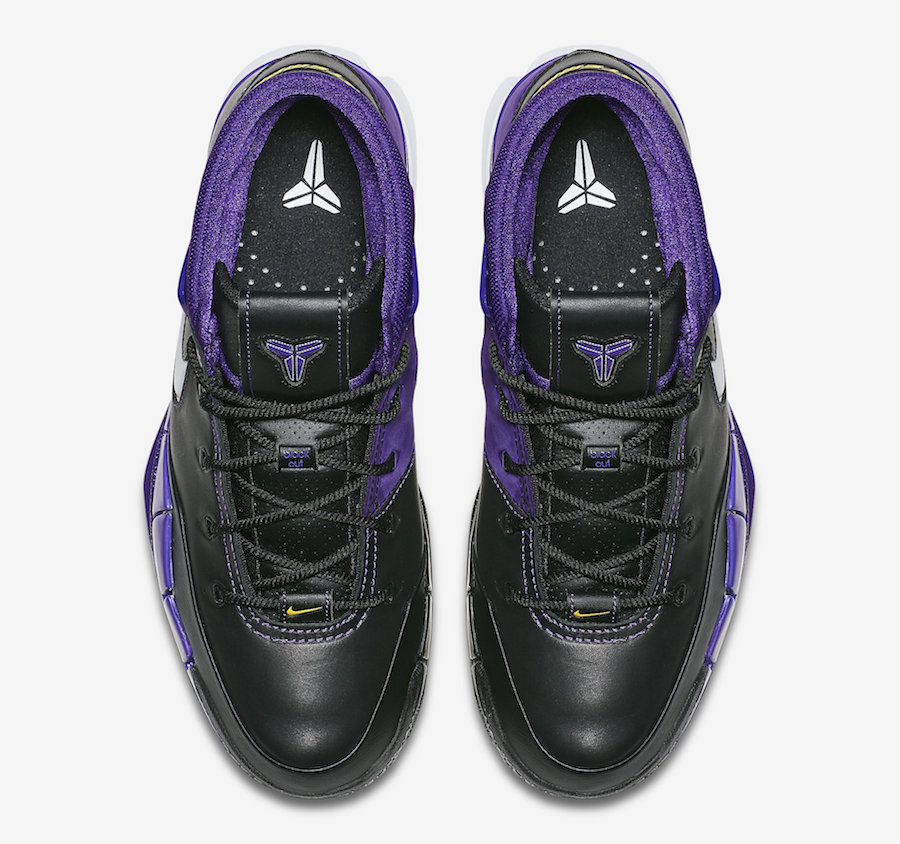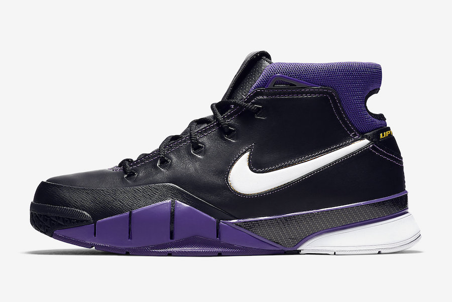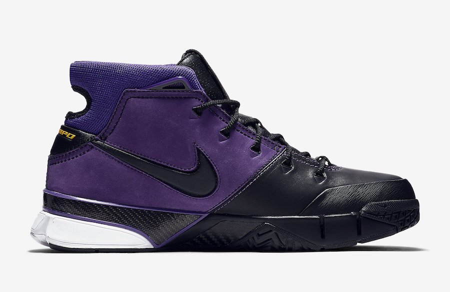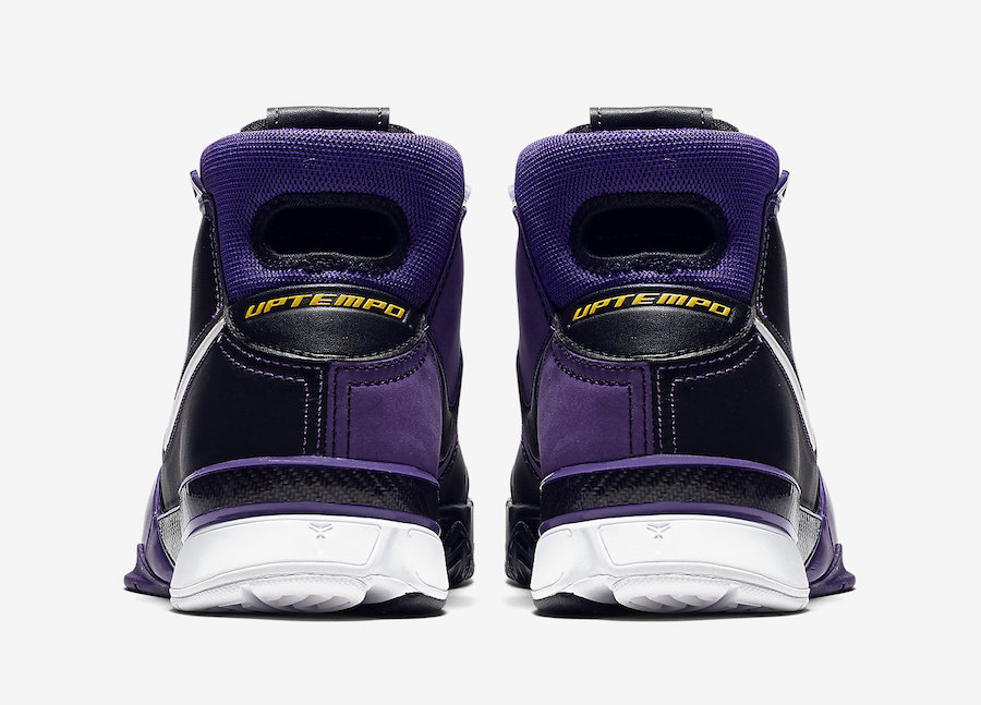 En attendant de voir potentiellement des Nike Kobe Protro 2 débarquer dans les bacs au cours des prochains mois, c’est donc une version Purple Reign des Protro 1 qui est disponible. Mêlant noir et violet sur sa partie supérieure mais aussi la semelle extérieure comme intermédiaire, le modèle est complété par des accents de blanc sur le Swoosh du panneau latéral extérieur. Et comme à Los Angeles le violet ne se balade jamais seul, on retrouve du jaune d’or sur la petite virgule placée sur les lacets ou encore l’inscription Uptempo au-dessus du talon. Forcément, il fallait bien un clin d’œil aux Lakers.