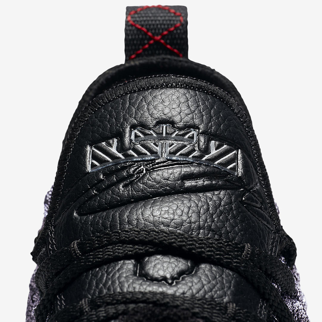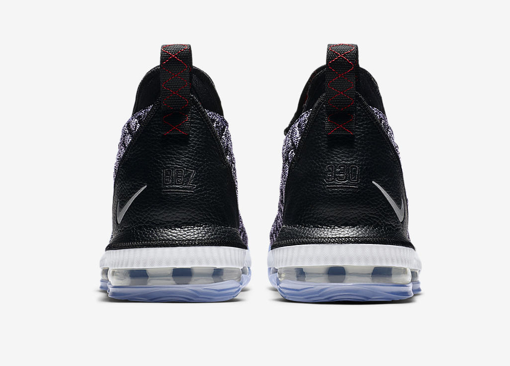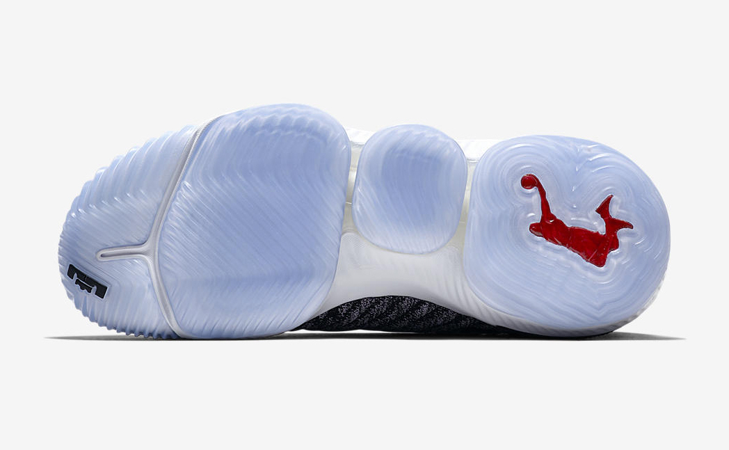 Un coloris qu’on retrouve sur tous les modèles de la firme de l’Oregon, à croire que certains dans les bureaux ont soit des actions chez Nabisco, soit développé une véritable addiction pour le biscuit. Bref, revenons-en à nos chaussures, on parlera goûter un autre jour. Les LeBron 16 s’affichent donc avec ce thème qui s’appuie sur du noir et du blanc. On retrouve ce mélange au niveau du Battleknit 2.0 qui recouvre la partie supérieure des pompes. Le renfort en cuir vers le talon est lui entièrement noir, tout comme la languette. La semelle intermédiaire laissant apparaître l’unité Zoom Air est blanche, alors que celle extérieure est translucide. Seul la silhouette de LeBron James dunkant tranche puisque ce logo se pointe en rouge.