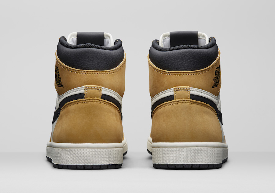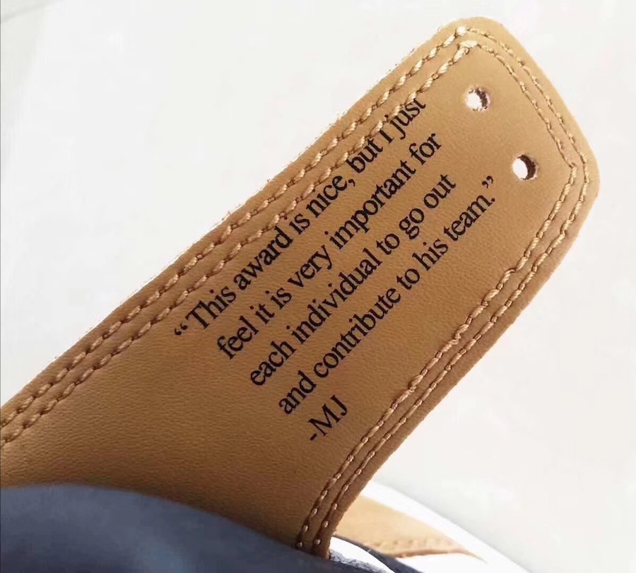 Comme leur nom l’indique, ces pompes sont inspirées de ses fringues lors de la remise de son trophée de meilleur débutant de la saison 1984-85 et plus particulièrement de sa sublime chemise caca d’oie ocre. On retrouve cette teinte que Nike baptise de manière un peu plus classe Gold Harvest – moisson d’or, sans commentaire – sur la base supérieure des Air Jordan 1. Mais la couleur ne couvre pas toute la chaussure puisque les panneaux latéraux sont blancs tout comme la languette, alors que les lacets et le contour de la cheville – en dehors des sangles qui gardent le ton jaunâtre de la tenue de Mike. Petit détail au niveau de celles-ci, deux inscriptions – une de chaque côté – qui rappellent la première campagne de Jordan et ses ambitions « This award is nice, but I just feel it is very important for each individual to go out and contribute to his team » et MJ. And the other has “1984-85, R.O.Y., 2313 points, and 28.2 ppg ». Alors certes, il faut que chaque joueur apporte sa pierre à l’édifice, mais dès sa première année, JoJo a posé des bases prouvant que certains contribuent plus que d’autres. Après ces belles phrases, on notera juste que la semelle intermédiaire est blanche alors que celle extérieure est noire. Ce sera tout pour nous.