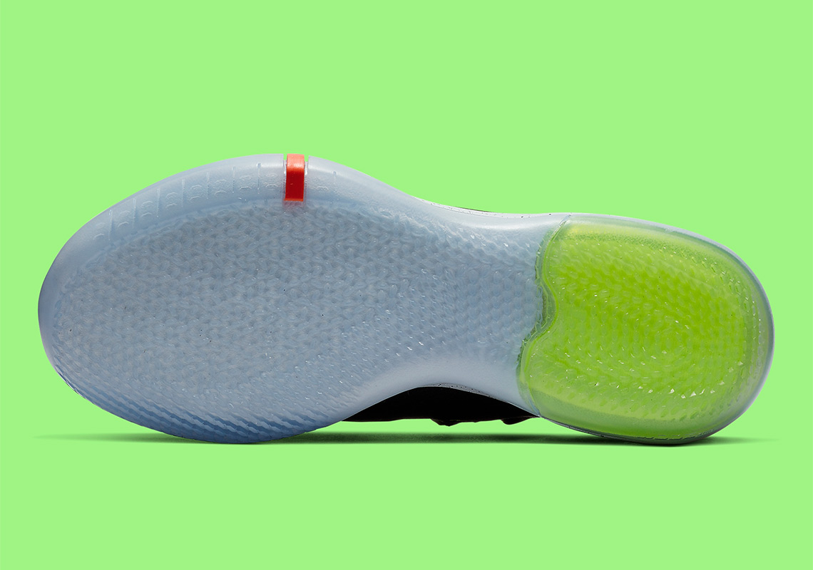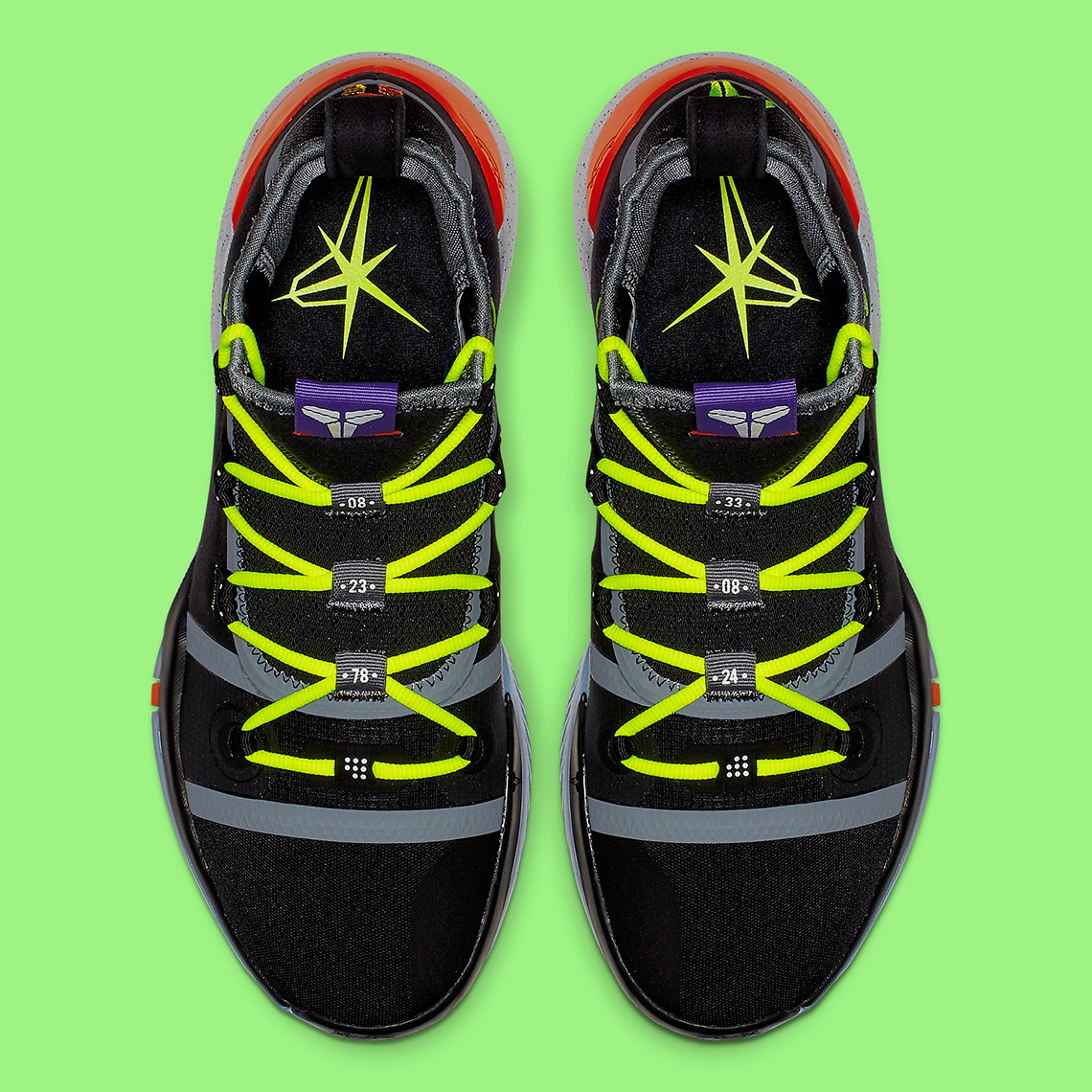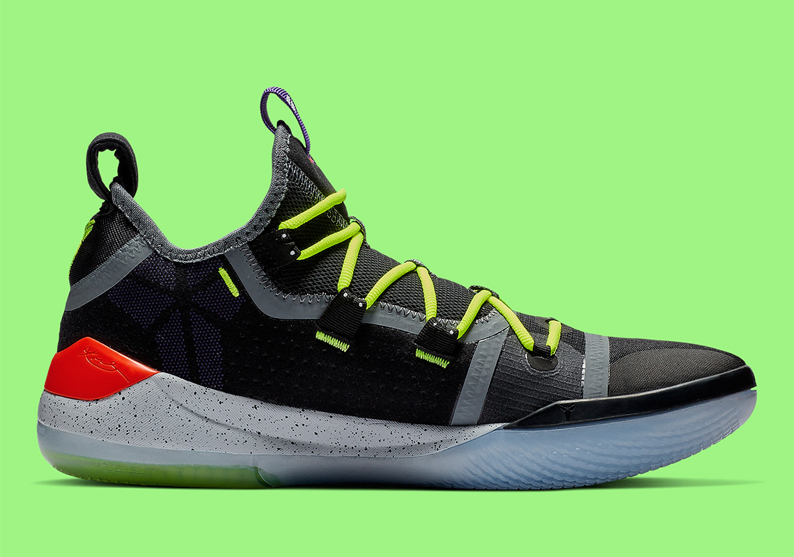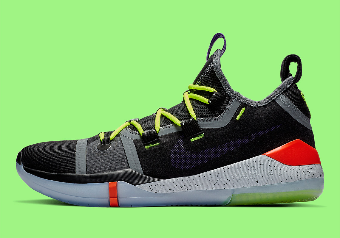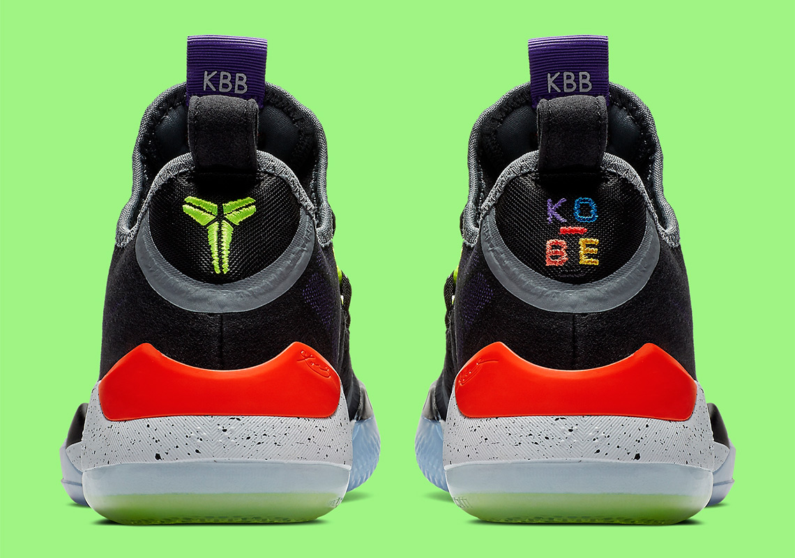 En effet, la version Chaos vient se poser sur les Kobe AD, en attendant éventuellement de la voir sur des Protro. Un style déjà aperçu sur les Kobe 6 par exemple et qui vient apporter des touches colorées et flashy sur une base en mesh noir supportant également des traces de gris. Pour égayer le tout, ce sont donc du vert électrique, du violet et un rouge tirant sur le fluo qui prennent place à différents endroits, comme les lacets, le logo sur la languette ou au-dessus du talon. C’est d’ailleurs à ce niveau-là qu’on aperçoit – pour le pied droit – une inscription KOBE coloré également. Enfin, on notera la semelle intermédiaire blanche criblée de points noirs alors que celle extérieure est translucide.