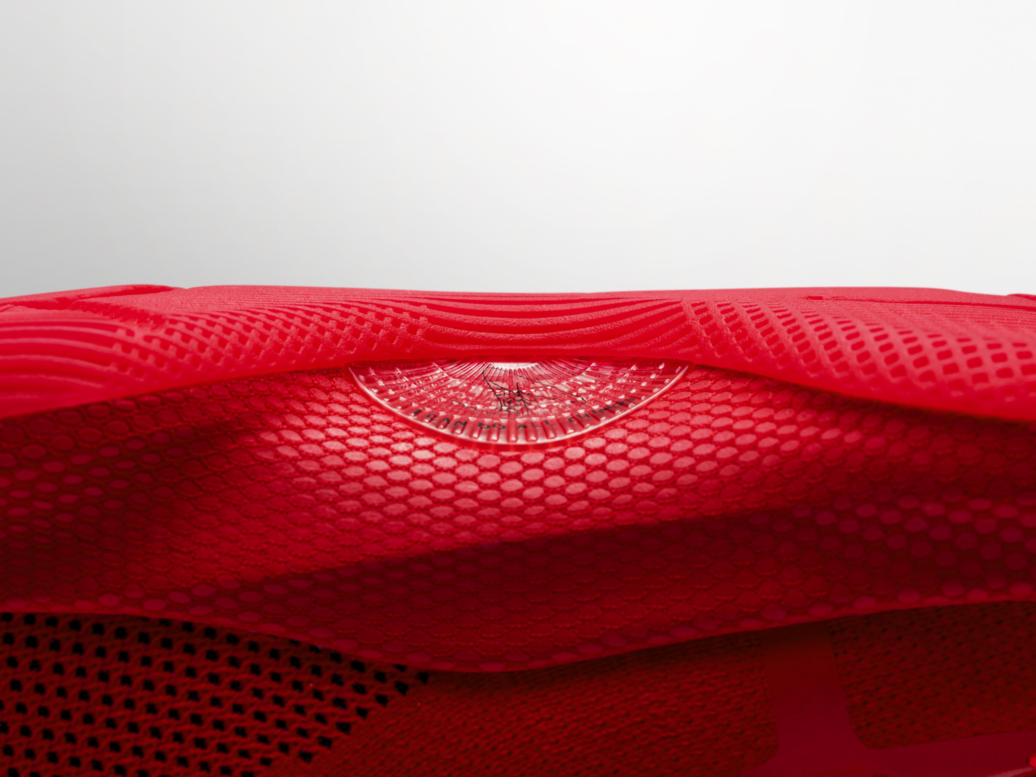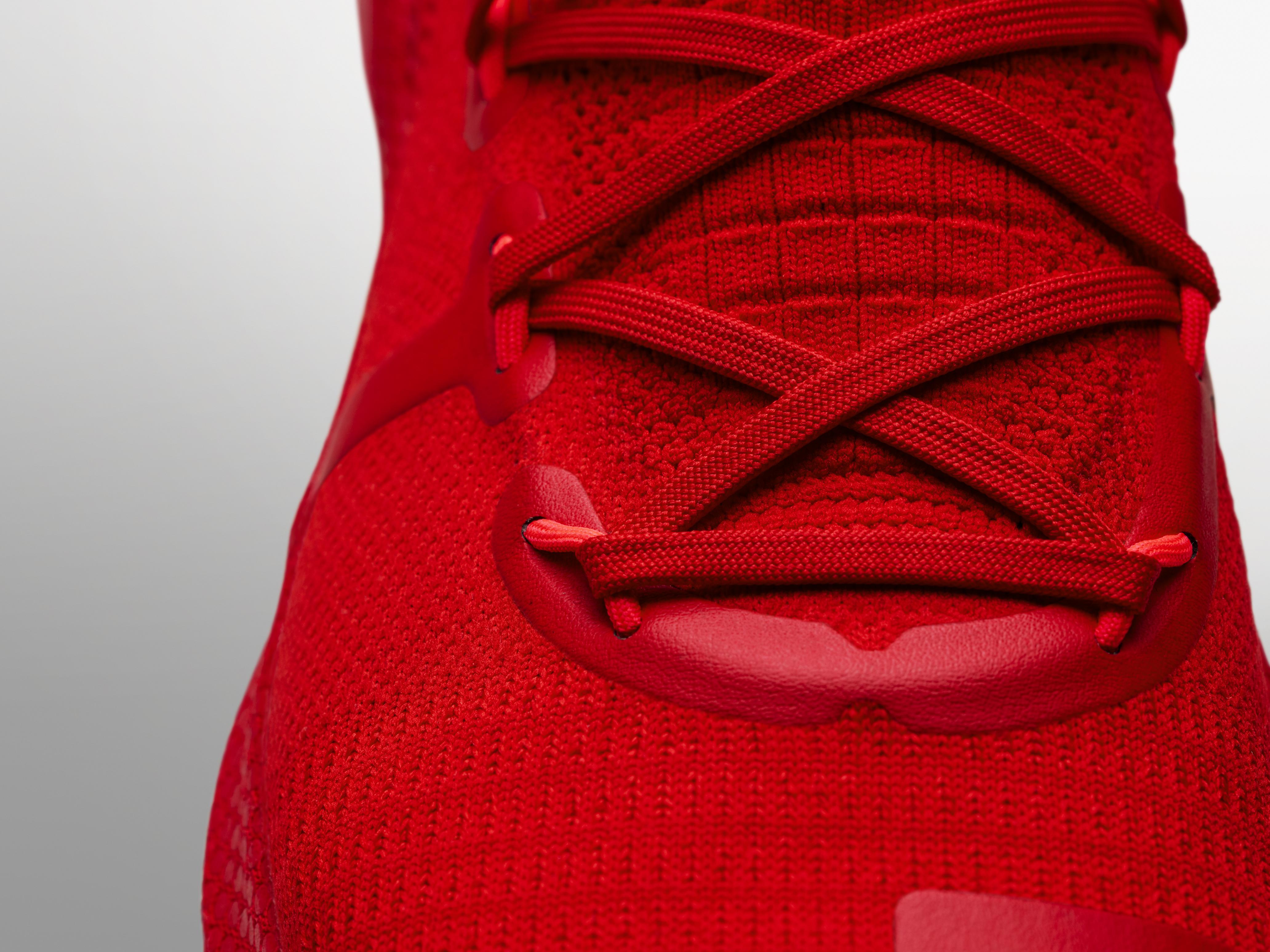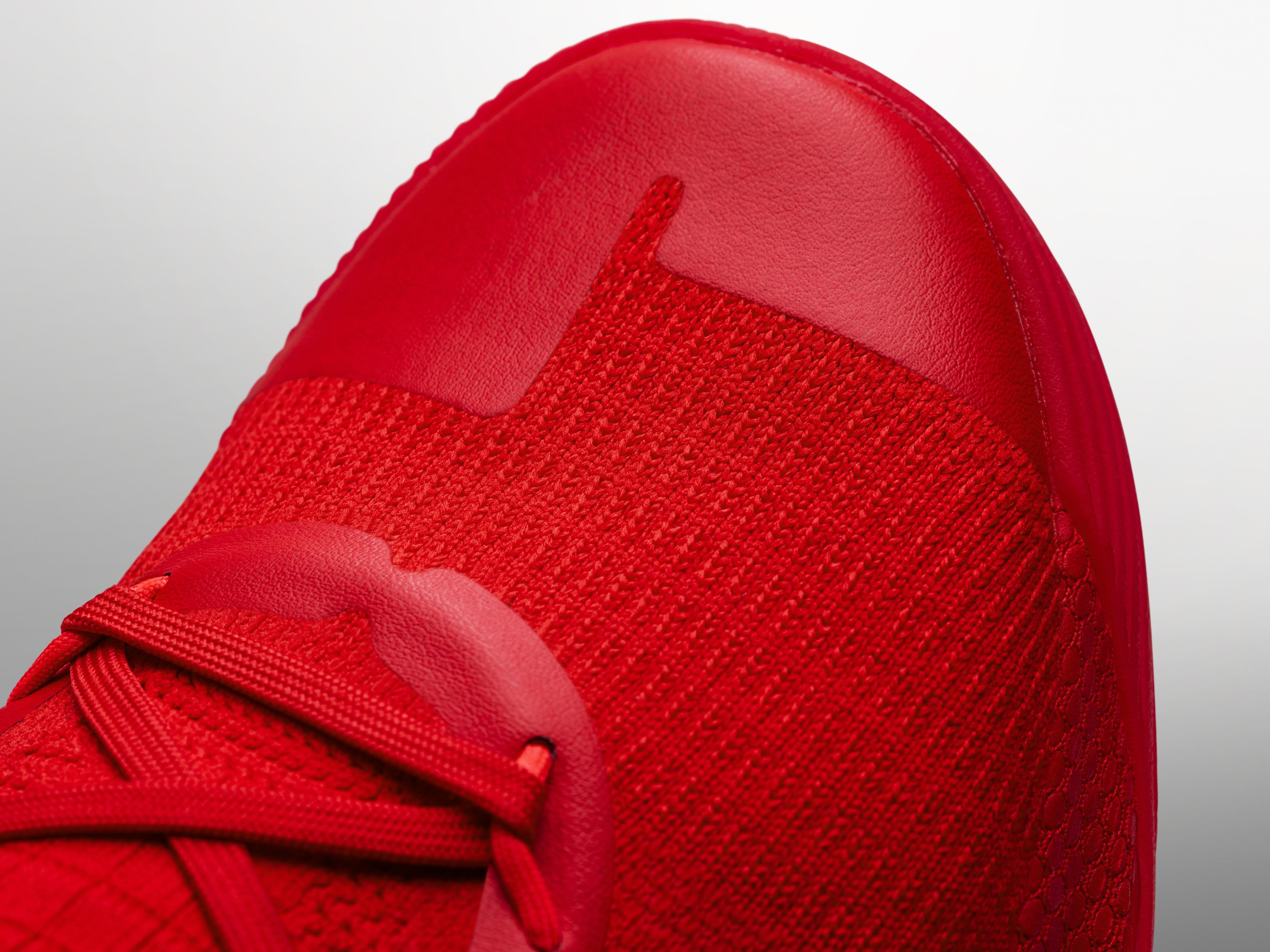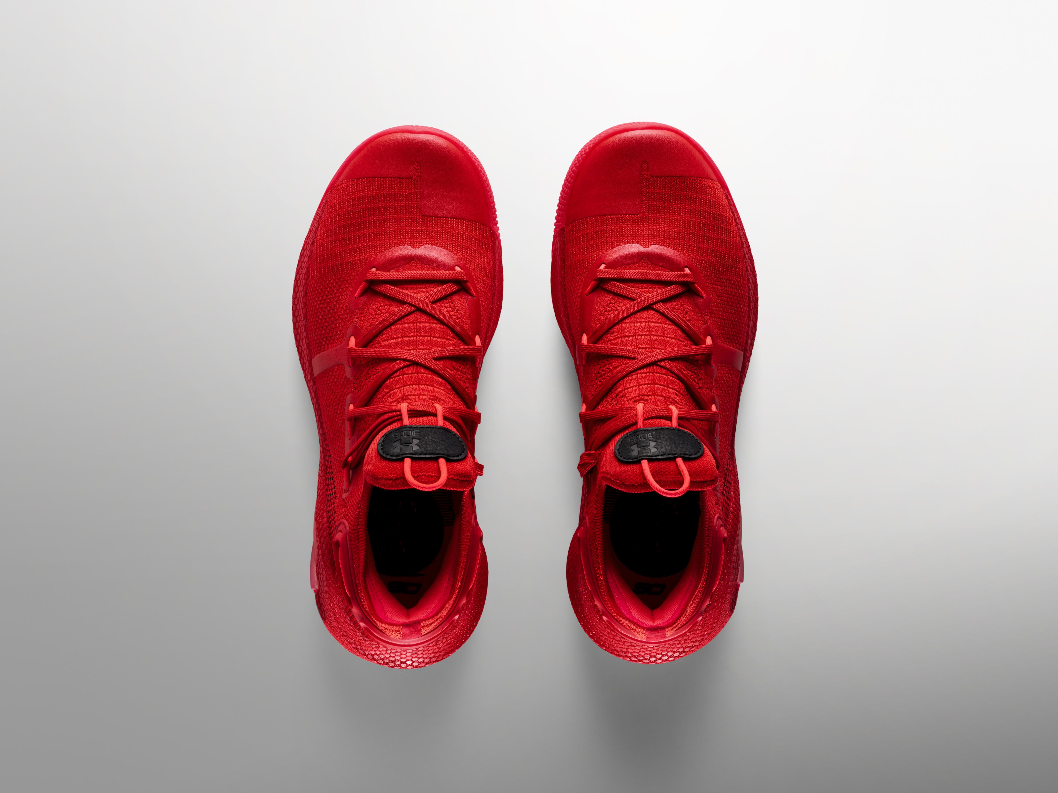 Qui dit cœur pense forcément au rouge. Et par conséquent ne sera pas déçu par ce coloris puisque cette teinte écarlate est présente sur la quasi totalité du modèle, simplement complétée par des touches de noir. Enfin une plutôt, puisque en dehors d’un écusson avec le logo d’Under Armour qui s’affiche donc en noir, pas de trace d’autre variation. Allez, on concède qu’une sous couche sous le knit à proximité de la cheville laisse apparaître également la teinte sombre discrètement. Mais pour le reste, pas de chichis. Que ce soit la partie supérieure en knit ou la semelle – aussi bien intermédiaire qu’extérieure – le rouge se trouve partout. Même les renforts à l’arrière au niveau du talon ou sur le devant vers les orteils conservent cette teinte.