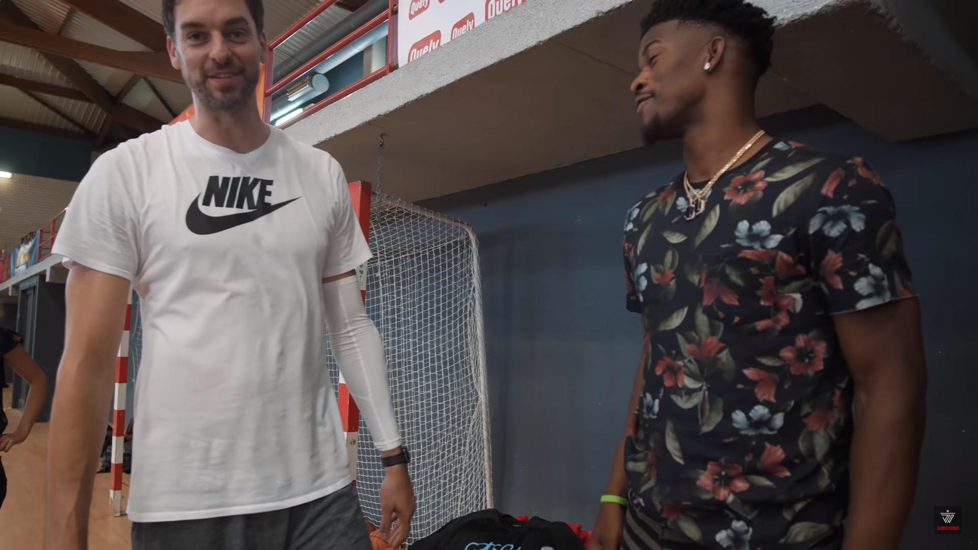 Le 6 juillet dernier, un joueur des Timberwolves a pris l’avion vers la péninsule ibérique pour faire une surprise à son ami joueur des Spurs. Quoi ? Vous ne savez pas de qui on parle ? Mais si, il s’agit de Jimmy Buckets qui squatte l’anniversaire de l’assassin de Villeneuve d’Ascq. Dans cette vidéo, les deux anciens coéquipiers des Bulls se retrouvent sous le soleil espagnol et en profitent évidemment pour toucher la grosse balle orange. Le jour de ses 38 ans, Pau animait son camp pour former de jeunes basketteurs comme le font beaucoup de joueurs NBA, et l’on voit JB et son pote espagnol martyriser les jeunes en un-contre-un avant de disputer des parties de 3×3 et de 5×5 d’une intensité forcément très relative. En dehors du basket, on peut voir le joueur de Sixers se balader tranquilou dans les rues, acheter une bouteille de vin ou encore jouer au football dans les couloirs d’un hôtel en déclarant sa flamme pour Neymar. Forcément, entre joueurs qui ne dépassent pas les quarts, on est solidaires. Enfin, ce trip se finit par un match associatif opposant les équipes de Pau et de Marc Gasol, avec d’autres joueurs NBA en plus de Butler comme Ricky Rubio par exemple. Entre les chants d’anniversaire lancés par l’ex-joueur des Wolves, les ballons de basket avec des bougies dessus et les matchs, le pivot espagnol s’est éclaté.