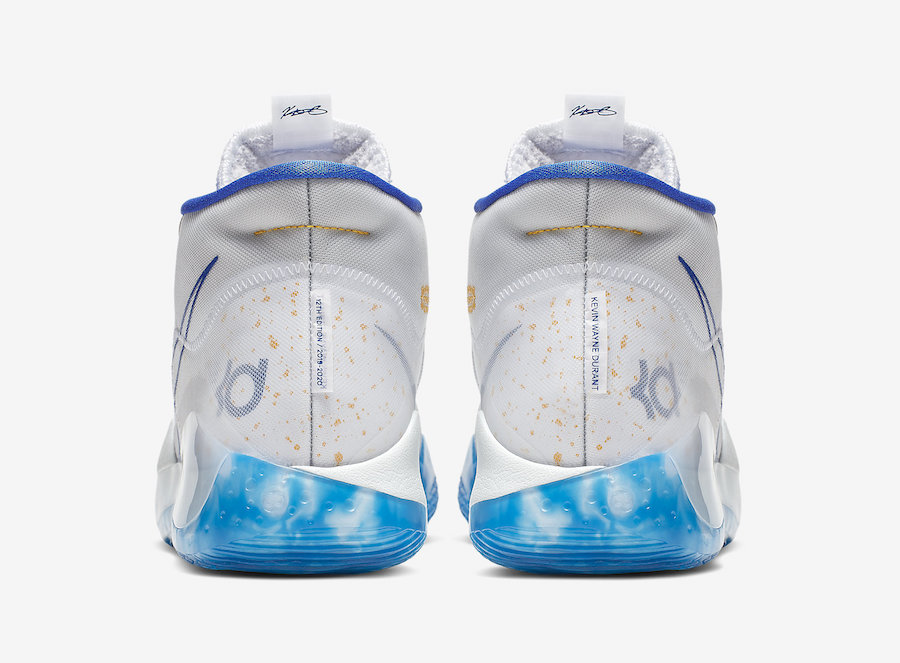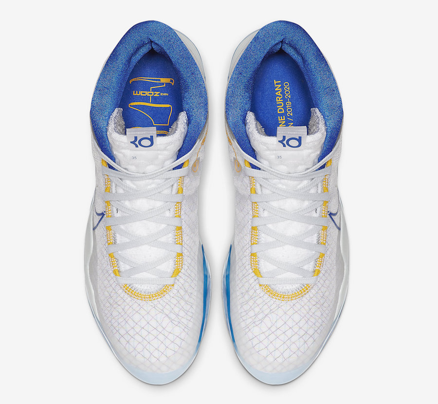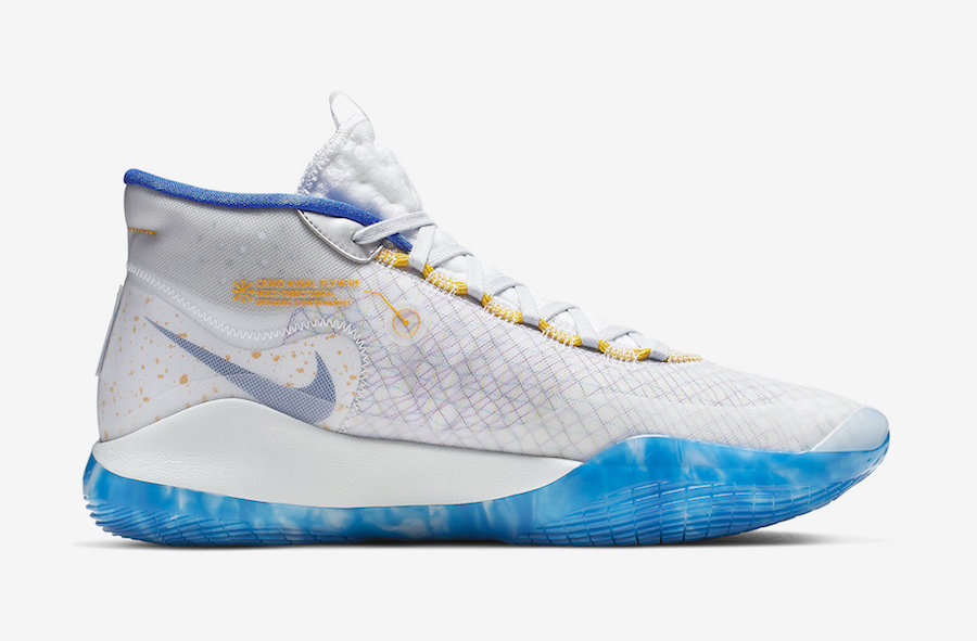 Alors que les Finales commencent, Durantula squatte encore l’infirmerie en pantoufles. Un confort auquel il est habitué tant les KD 12 sont aussi agréables à porter que des charentaises, tout en étant bien plus adaptées au basket que vos chaussures d’intérieur. Nike étant quand même à la cool avec son homme-sandwich, la marque a proposé à l’ailier un coloris qui lui permet d’être un supporter de choix pour son équipe. En effet, les dernières pompes de Kevinou reprennent les couleurs des Warriors à domicile, à savoir une base blanche appuyée par des détails en jaune et bleu. On les trouve en particulier sur le contour du Swoosh, vers les œillets des lacets. La teinte azure se glisse également sous les pompes, sur la semelle translucide et marbrée.