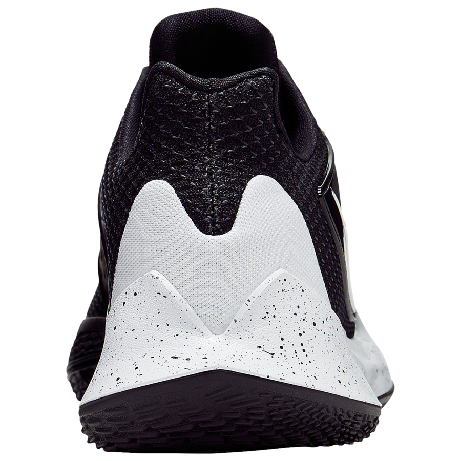 En effet, on ne sait pas si Nike était dans la confidence ou s’il s’agit d’une simple coïncidence vu que les teintes utilisées sont plutôt classiques, mais les Kyrie Low 2 sorties le premier juillet débutent en noir et blanc. Pas besoin de vous faire un dessin, vous avez déjà compris qu’il s’agit des mêmes couleurs que celles des Nets, franchise qui va profiter des talents d’Uncle Drew les prochaines années. Le modèle à tige basse – comme son nom l’indique – s’affiche avec son mesh noir de composition légère avec un renfort en plastique à mi-pied. Celui-ci aussi conserve le ton sombre, tout comme la base de ces pompes. Le blanc lui va se glisser sur les Swoosh des panneaux latéraux et à proximité du talon, ainsi que sur la semelle intermédiaire à l’arrière de la chaussure. Sur ce dernier emplacement, la zone n’est pas complètement immaculée puisque Nike a intégré un mouchetage noir. Pour finir, la semelle intermédiaire – en dehors de l’arrière donc – ainsi que celle extérieure reprennent la teinte black, laissant juste voir un logo KI en blanc sous le pied.