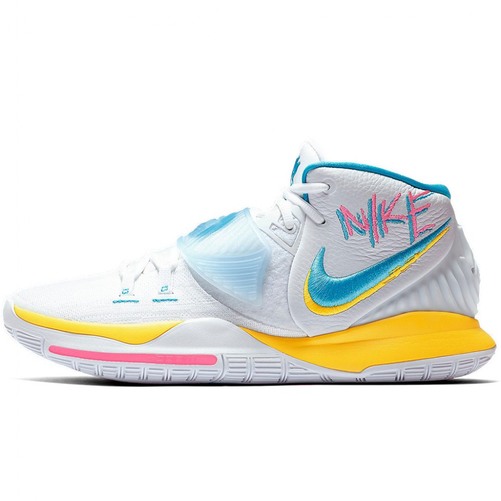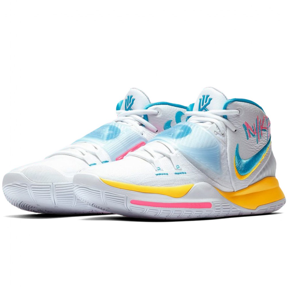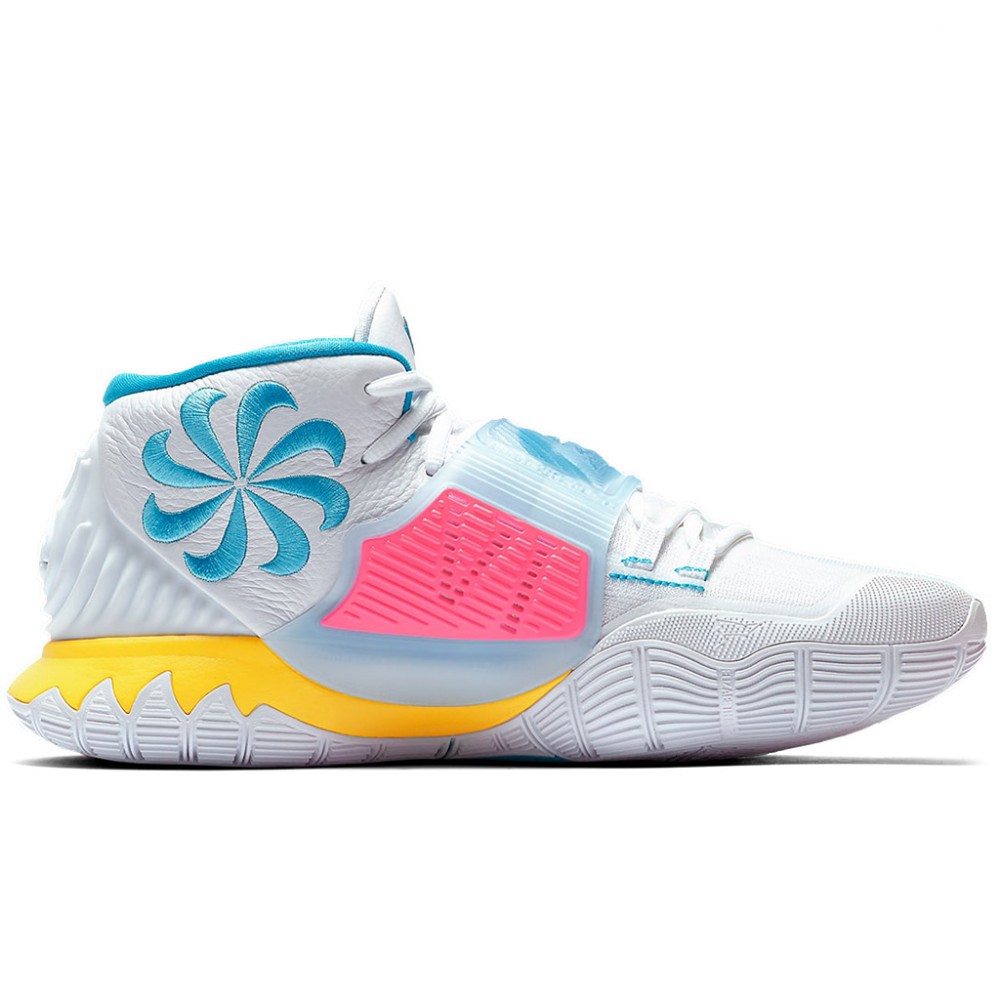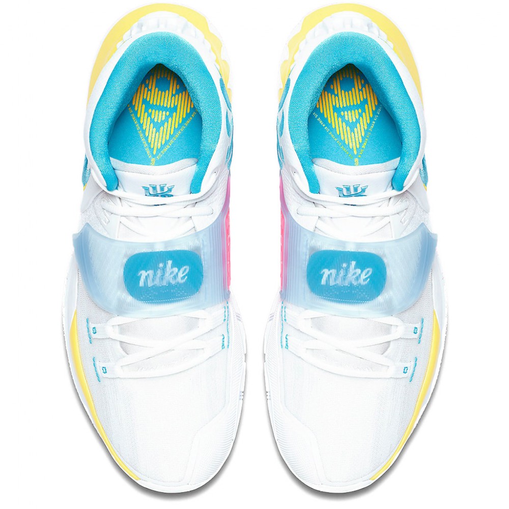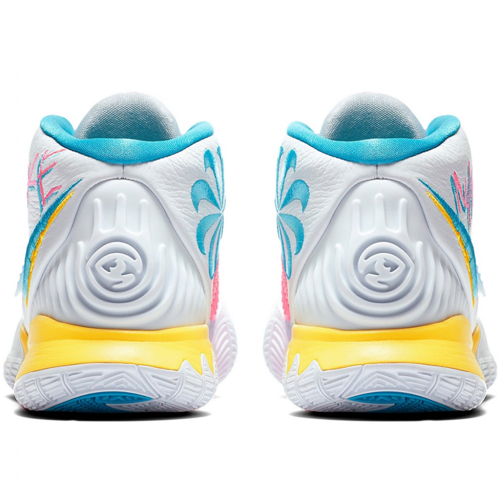 Si Uncle Drew n’était pas sous contrat avec les Nets jusqu’en 2023, on se poserait légitimement la question de savoir si ce dernier coloris des Kyrie 6 n’était pas un clin d’oeil au Heat pour se faire signer du côté de Miami. Pour ce coloris très estival, on retrouve ainsi des teintes bien connues des abonnées de l’American Airlines Arena avec du rose et du bleu désormais directement associés à la franchise floridienne dans l’inconscient collectif. Du jaune complète ces couleurs primaires légèrement arrangées sur la midsole alors que le reste de l’empeigne en cuir et flyknit est vêtue de blanc. A l’intérieur de la cheville, un logo en spirale brodé bleu rajoute du relief alors que le Swoosh est lui aussi cousu pour un résultat final très quali.