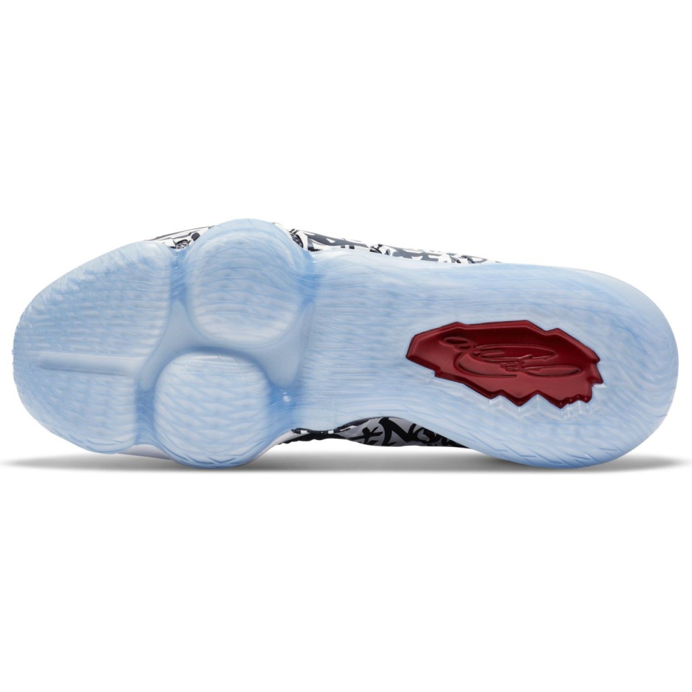 Les Playoffs arrivent, LeBron va passer en mode cyborg, l’eau mouille. Voilà des choses qui paraissent normales pour tout le monde. Pour autant, avec cette année assez… spéciale, c’est bien aux J.O. de Tokyo que le King aurait du faire du sale. Malheureusement, c’est repoussé à l’année prochaine. Tant pis, les équipes qui croiseront les Lakers en Playoffs prendront cher à la place, voilà. Ainsi, pour notre grande satisfaction, à Beaverton, dans les locaux de Nike, pas question de s’empêcher d’honorer le pays d’origine une année olympique. On a donc droit à deux modèles en mode alternés de la LeBron 17. Une belle affaire pour tous les collectionneurs qui vont remplir deux cases au lieu d’une. Et comme d’habitude, c’est encore un carton plein visuellement pour les deux versions de la paire. Pour l’empeigne, l’une est rouge, l’autre bleu foncé, et les deux toujours parsemées de ce motif écaillé en relief sur les côtés. La languette de verrouillage est grise, et le swoosh bleu ou rouge en fonction de la variante pour laquelle vous opterez. Véritable point fort de cette chaussure ? La semelle intermédiaire est blanche et couverte de graffitis là encore très bien dosés et rajoute de la couleur de la chaussure. Cependant, ces « tags » n’effacent pas la luminosité du fond blanc et permettent en plus de la renforcer. Pour finir, la semelle extérieure est transparente, classique mais ça évite tout faux pas dans une composition mine de rien assez complète.
