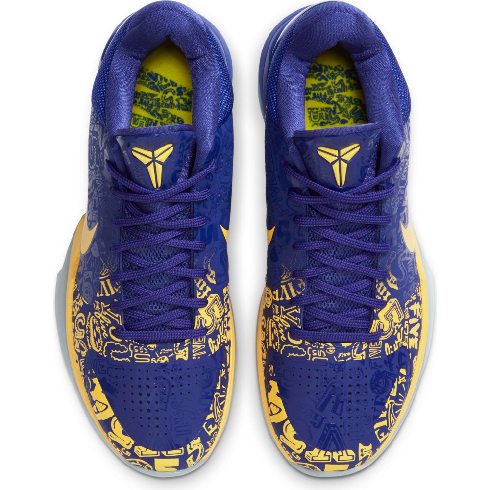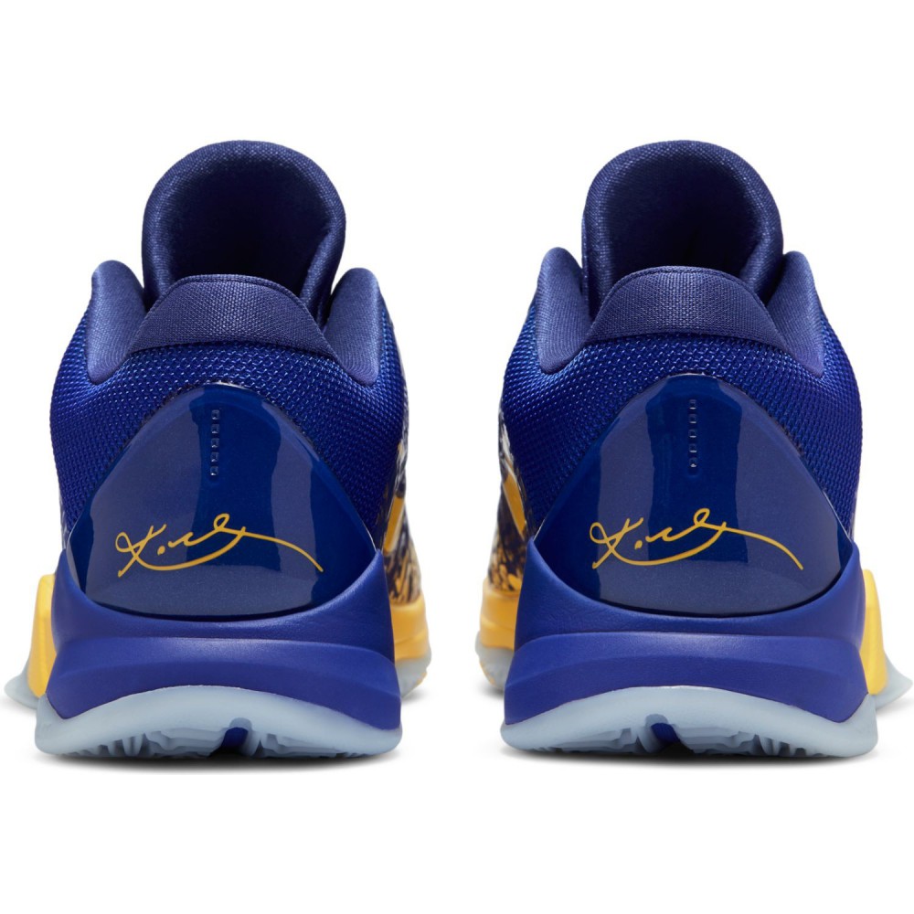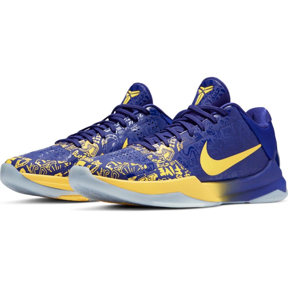 En remportant le titre avec Los Angeles en Floride, LeBron James a continué d’écrire sa légende en gagnant sa quatrième bague et son quatrième trophée de MVP des Finales dans trois franchises différentes. Un record qui le laisse tout de même avec un titre de champion de moins que Kobe Bryant jusqu’à présent, le Mamba en ayant remporté cinq avec son équipe de toujours. C’est justement pour célébrer cette domination entre 2000 et 2002 puis en 2009 et 2010 que la firme de Beaverton a décidé de sortir une réédition du coloris 5 Rings des Nike Kobe 5 Protro datant de 2010. On ne présente plus la silhouette des petits bijoux à coupe basse que portait Vino durant la fin de sa carrière. Pour les couleurs, le jaune est fortement présent tandis que le mauve de la franchise vire légèrement au bleu avec toute une déclinaison d’inscriptions du chiffre 5 sur l’ensemble de l’empeigne. Le logo du Mamba est évidemment présent sur la languette alors que la signature du champion magnifie la paire au niveau du talon.
