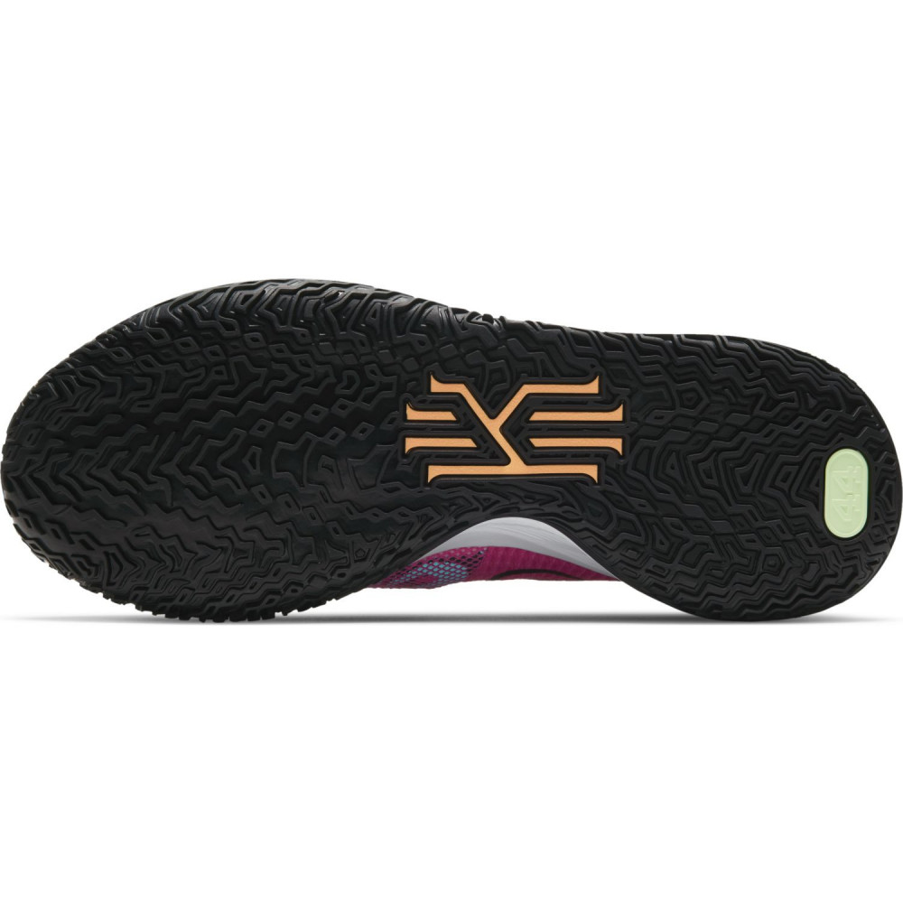 C’est la bae de nombreux basketteurs depuis des années, la Nike Kyrie fait peau neuve pour la septième saison consécutive. On ne change pas les ingrédients avec toujours cette midsole dentelée pour donner un ton agressif à la paire et aussi cette multitude de couleurs propre au meneur des Nets. Quoi, la franchise joue en noir et blanc ? On vous conseille quand même d’enfiler des lunettes de soleil pour admirer le roi du crossover en plein récital. D’abord pour ne pas abîmer votre rétine avec des bouts d’os des chevilles de ses adversaires qui auraient volé un peu trop loin mais aussi pour ce festival de tons pastels, du rose au vert en passant par le orange. On reconnait bien là la patte des designers des Kyrie, jusqu’au niveau du talon où l’oeil de la sixième du nom est présent en beaucoup plus petit et juxtaposé à une note de musique. Dans le jeu comme dans la vie, Kyrie Irving ne suit pas la mode, il la crée. Et cela donne ce résultat final qui devrait avoir réussi à attirer votre regard en quelques secondes.