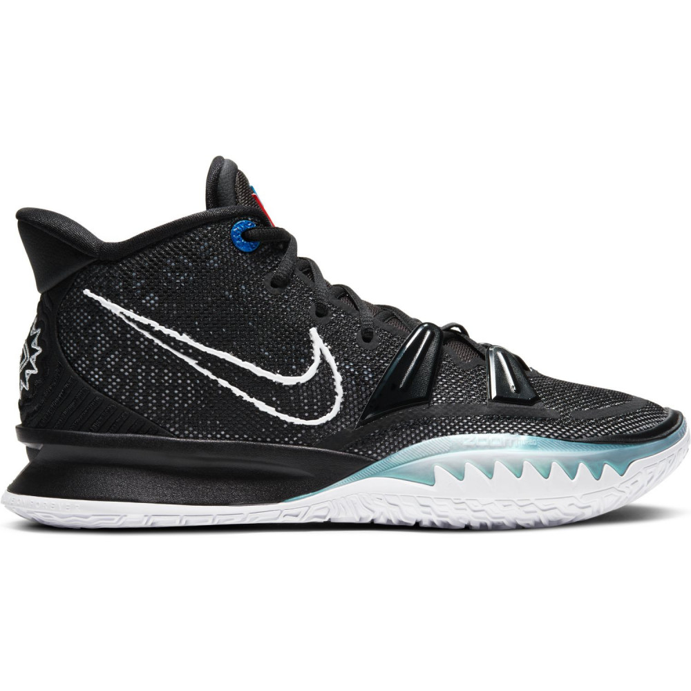 On a beau le savoir, on a beau l’avoir vu faire du sale dès son premier match à domicile au Barclays Center avec 50 pions, il va encore nous falloir un tout petit peu de temps pour nous habituer. Depuis son départ de Cleveland via un trade contre IT en 2017, le casseur de cheville peine un peu à trouver pleinement sa place. Mais à 28 ans et avec le meilleur attaquant de la planète à ses côtés dans une équipe qui le sonde avant de prendre chaque décision, Kyky a l’air dans la situation idéale pour frapper un grand coup et se lancer en quête de sa deuxième bague individuelle dès cette année. Pour ne pas qu’il se trompe de camps parce qu’il pense trop à force d’imaginer la Terre plate, son équipementier s’est donc occupé de lui concevoir un coloris dédié à sa nouvelle franchise pour les dernières Nike Kyrie 7. Comme on peut l’imaginer, c’est le noir qui prédomine avec quand même une semelle blanche et une midsole dentelée bleu translucide à l’avant du pied. Et pour matcher avec les futurs maillots City Edition des Nets, on repère également le même trio de couleurs bleu, jaune et rouge qui sera présent sur la tunique dessinée en hommage à l’art de Jean-Michel Basquiat. Enfin, sur les talons, les légendaires yeux ouverts sont toujours bien là, brodés pour représenter un motif qui a légèrement évolué par rapport au modèle de signature shoes précédent.