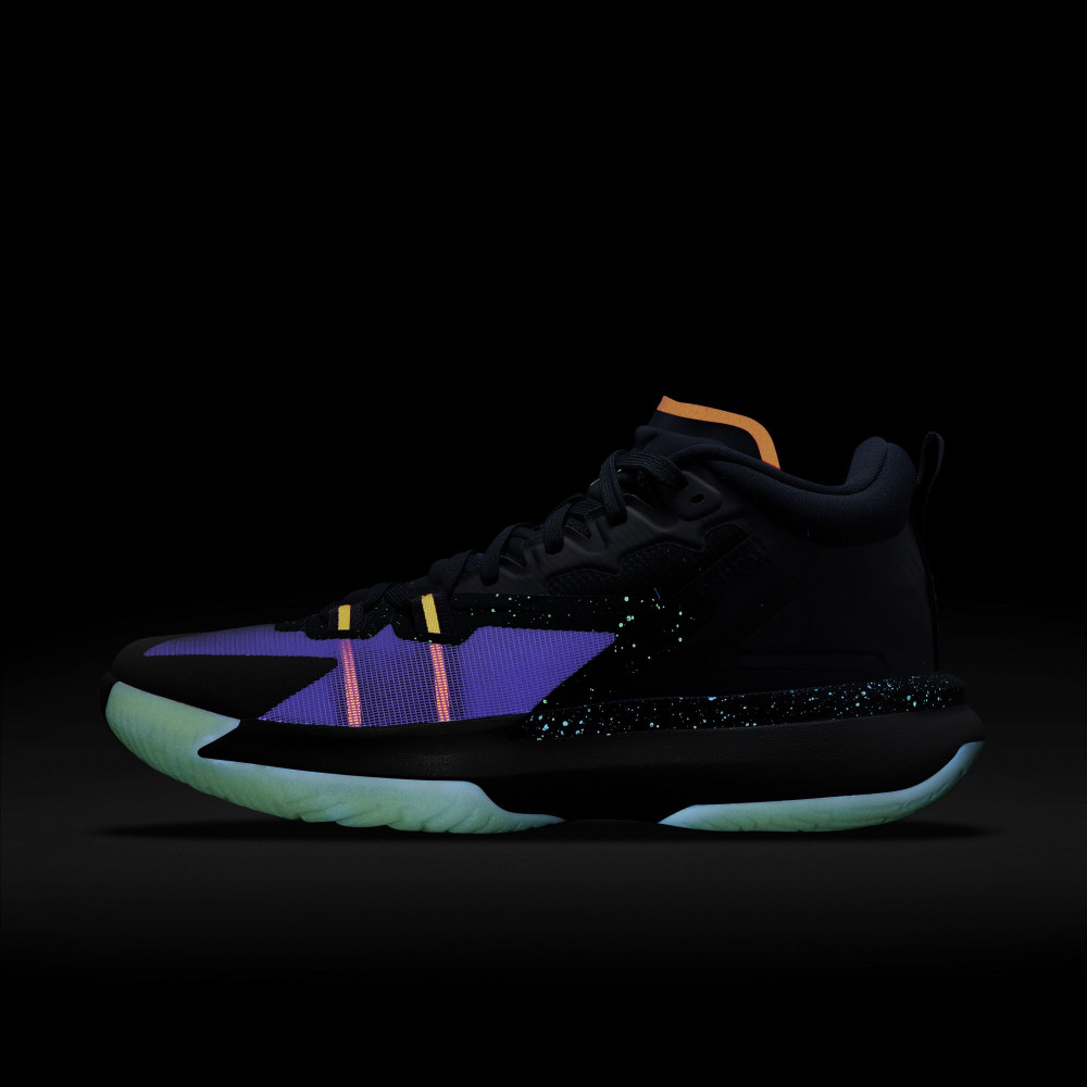 Zeus est puissant mais délicat, on peut le voir bouger coast-to-coast Sébastien Chabal et finir dans la peinture avec un dunk aussi rageant que lorsqu’il apprend que LaVar Ball vient voir son fils à l’entraînement, ou bien finir avec un toucher tellement gracieux que la Reine Elisabeth II regarde ses highlights. La belle combinaison de bleu, pourpre vif et indigo nuageux de la Jordan Zion 1 ZNA symbolisent le côté météorite de l’ascension du numéro 1 de New Orleans. La paire est bien pensée pour l’athlète des Pelicans, équipée de la technologie Air Strobel sur tout le long de la semelle, le pied est sur un petit nuage, un petit nuage permettant de dunker éléphantesquement. Cette technologie permet plus de confort sans pour autant éloigner le feeling du parquet. Ces sensations sont amplifiées par le Zoom Air, présents sous les doigts de pied, pour que le sentiment de sécurité et d’absorption des chocs optimise les performances. En somme, une parfaite équation pour aider les qualités du Z. A cela s’ajoute une languette rembourrée pour enlever la pression des lacets, sans pour autant enlever de la légèreté à la chaussure qui est un des atouts majeurs de cette de ces Jordan Zion 1 ZNA. En bref, cette paire répond aux attentes d’un joueur comme le drafté 2019 numéro 1, des chaussures explosives avec une très bonne adhérence et de la légèreté pour la rapidité. Vous croyiez que le Père Noël allait vous oublier c’est ? La petite surprise c’est que… elles brillent dans la nuit ! Pas très pratique si vous jouez pendant le couvre-feu…