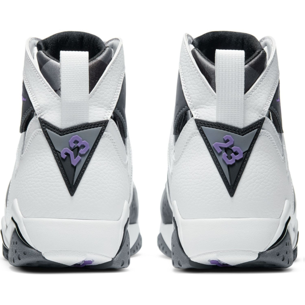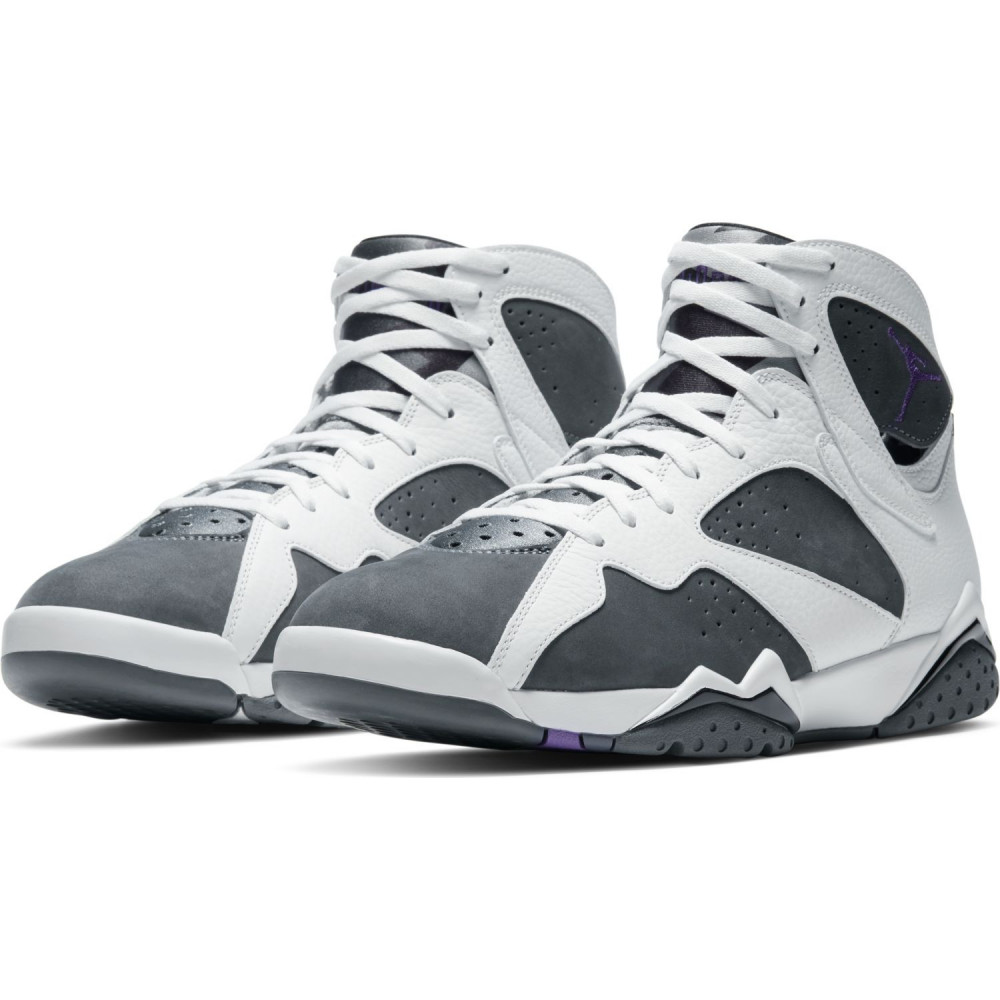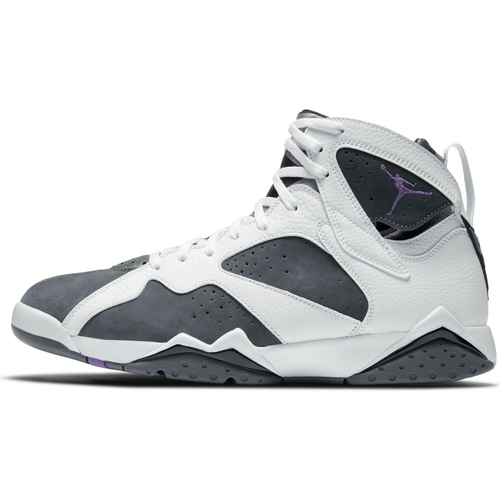 Air Jordan 7, c’est un second titre NBA pour Michael Jordan et une médaille d’or olympique. Une année 1992 qui fut donc extrêmement prolifique pour His Airness, qui inscrit 35 points dont six paniers à trois points en première mi-temps du match 1 des Finales NBA, battant au passage le record de points et de paniers à trois points inscrits en une mi-temps lors des Finales. A l’époque, ce sont les Blazers de Clyde Drexler qui en ont fait les frais. Et puis les Français se souviennent évidemment du match amical perdu 111-71 face à la Dream Team à Monte-Carlo, quelques jours avant le début des Jeux Olympiques de Barcelone. Bref, trêve de statistiques et d’anecdotes en tout genre, la AJ7 arbore donc un sacré héritage de Michael Jordan, pouvant de ce fait vous propulser vers l’infini et l’au-delà, à savoir le niveau stratosphérique de MJ. Sur ce modèle Flint, on retrouve un cuir épais granuleux blanc et du suède (non, rien à voir avec Jeffery Taylor et Jonas Jerebko, les deux seuls du pays d’Ikea à avoir joué en NBA) gris, le même gris qu’il y a sur la semelle, sur le chausson Huarache (spécialité de chez Nike et Jordan) et les panneaux latéraux entourant la cheville. Le 23 du talon et le Jumpman situé sous la semelle sont violets, de quoi être assorti lorsque vous irez cueillir des fleurs sauvages et des violettes. Oui, la cote de cette dernière phrase est à 35,50 mais on ne sait jamais, les Bulls ont bien battu les Celtics, donc tout est possible.