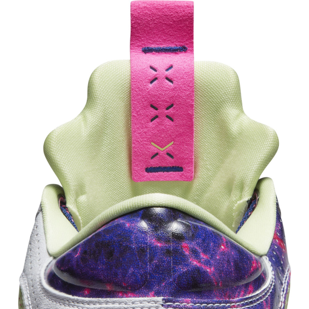 Parfois, on se demande bien qui s’occupe de donner un nom aux différents coloris de chaque paire de pompes. En l’occurrence, on ne pouvait guère faire plus bel oxymore que celui-ci pour désigner le modèle dédié à la star des Dallas Mavericks. Certes, la pureté de ses actions et son incroyable instinct nous poussent parfois à nous demander s’il ne vient pas d’une contrée beaucoup plus obscure encore que la Slovénie, voire d’une autre galaxie. Mais le terme de déception ne peut pas être plus éloigné de la réalité pour désigner El Matador qui illumine notre ligue depuis son arrivée il y a à peine trois ans. Pour rentrer un peu plus dans le détail, les Air Jordan XXXV lui font tout de même honneur avec un rendu final qui devrait plaire au king du bottle flip challenge. Du blanc sur l’empeigne et une semelle ainsi que l’intérieur de la chaussure revêtue d’un vert pâle qui rappelle le maillot avec lequel il a été sacré champion d’Europe en 2017. Le logo de Luka est présent sur une des deux languettes et sur les deux semelles intérieures et un cocktail cosmique vient emballer le tour avec des touches de mauve, de rose et de noir qui nous propulse directement dans l’espace. Un petit peu comme quand on regarde le jeune insolent nous éclabousser de son art.