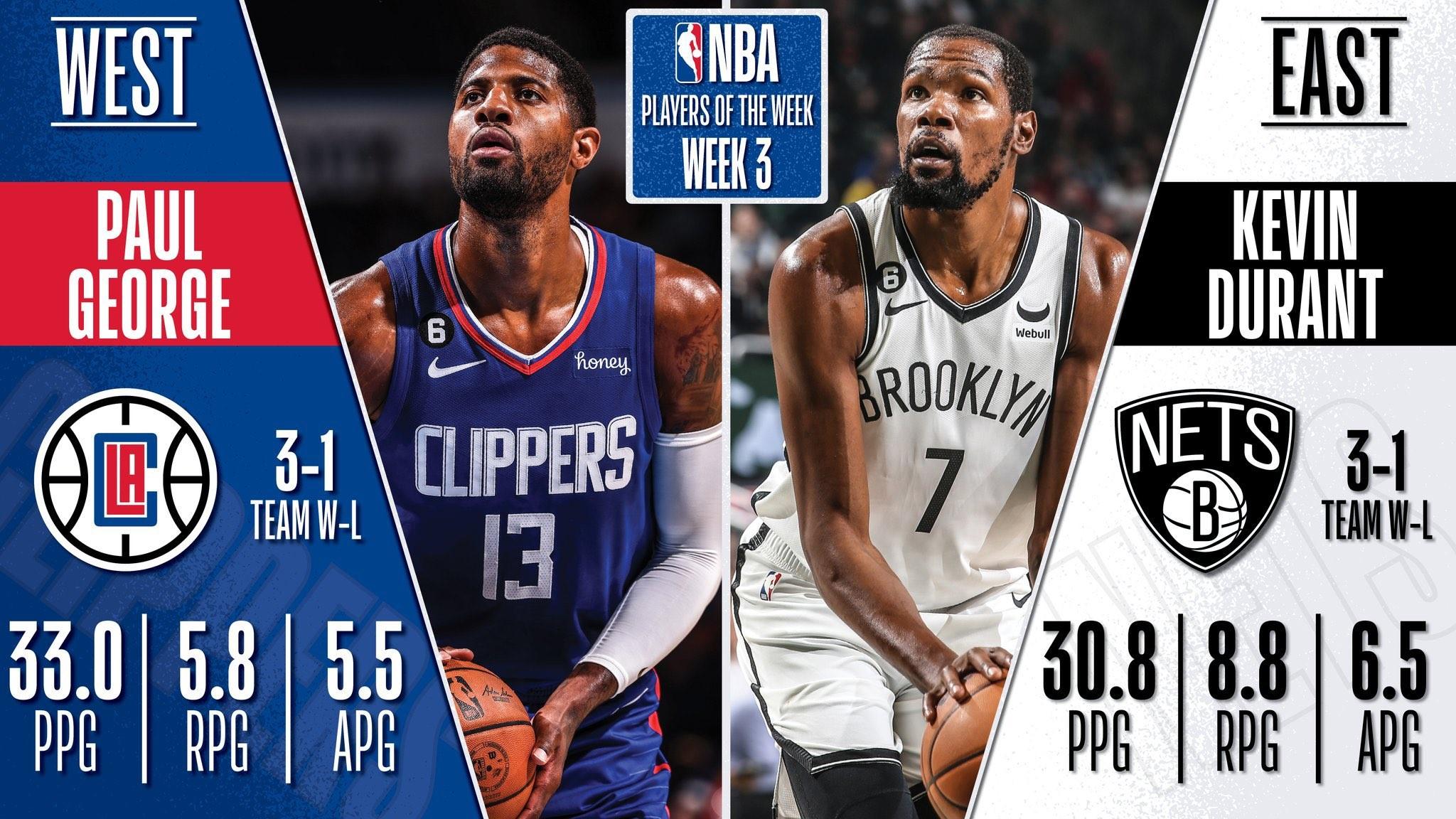 Vous connaissez la petite tradition du lundi soir : comme à chaque début de semaine, la NBA délivre une récompense au meilleur joueur des sept derniers jours dans chaque conférence. Aujourd’hui, honneur aux anciens avec Paul George et Kevin Durant.
