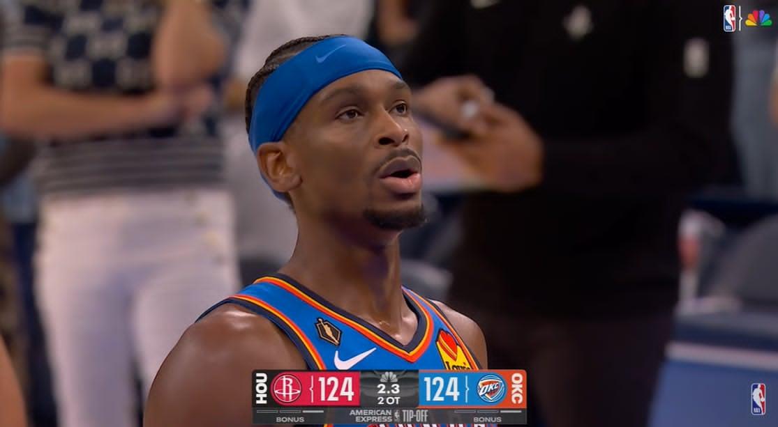 On passera rapidement sur Kevin Durant qui demande un temps-mort juste avant le buzzer alors que les Rockets n’en avaient plus, ce qui aurait du occasionner une faute technique, on l’oublie vite car la fin de match est dantesque, à tel point qu’il faudra finalement une deuxième overtime pour départager tout le monde. Prolongation lors de laquelle le MVP en titre fait du sale, il terminera ce match de reprise à 35 points, et à l’issue de laquelle Kevin Durant fait justement faute sur… SGA à deux secondes de la fin. 2/2 aux lancers évidams, et voilà comment le Thunder réussit son coup, sans Jalen Williams ni Isaiaha Joe, mais avec un Ajay Micthell visiblement transfiguré depuis qu’il a emmené un membre de TrashTalk dans sa bagnole.